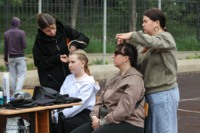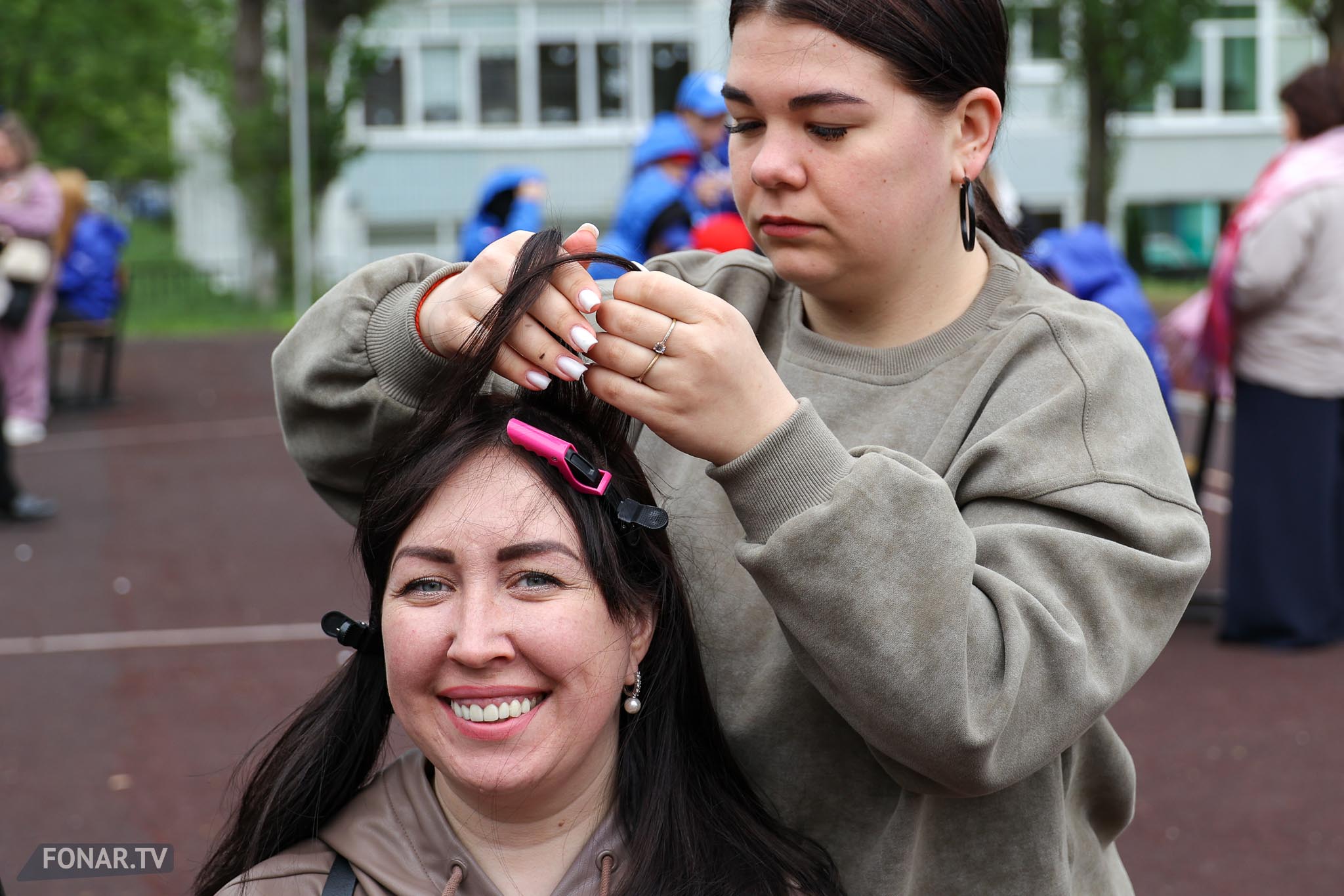 Девушки-парикмахеры плели косы девочкам и женщинам — дань русским традициям и практичность в спортивной атмосфере.