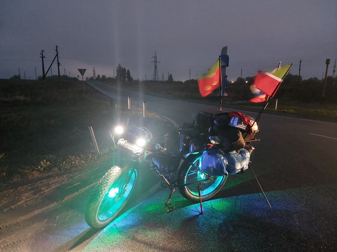 Сейчас Сергей ездит на фитбайке — «велосипед-тяжеловоз» на широких мощных колёсах, повышенной проходимости. На нём 40 килограммов груза: палатка, посуда, одежда на все сезоны, удочки и прочее для автономного выживания в лесу и на дорогах.