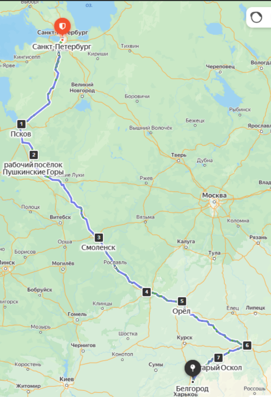Казань → Йошкар-Ола → Нижний Новгород → Кострома → Ярославль → Череповец → Вологда → Архангельск → Северодвинск → посёлок Мирный, Архангельская область → Каргополь → Пудыш → Медвежьегорск → нацпарк Сортавала, Карелия → Медвежьегорск→ Петрозаводск → Приозёрск, Ленинградская область → Санкт-Петербург → Псков → Смоленск → Брянск → Орёл → Воронеж → Старый Оскол → Белгород.