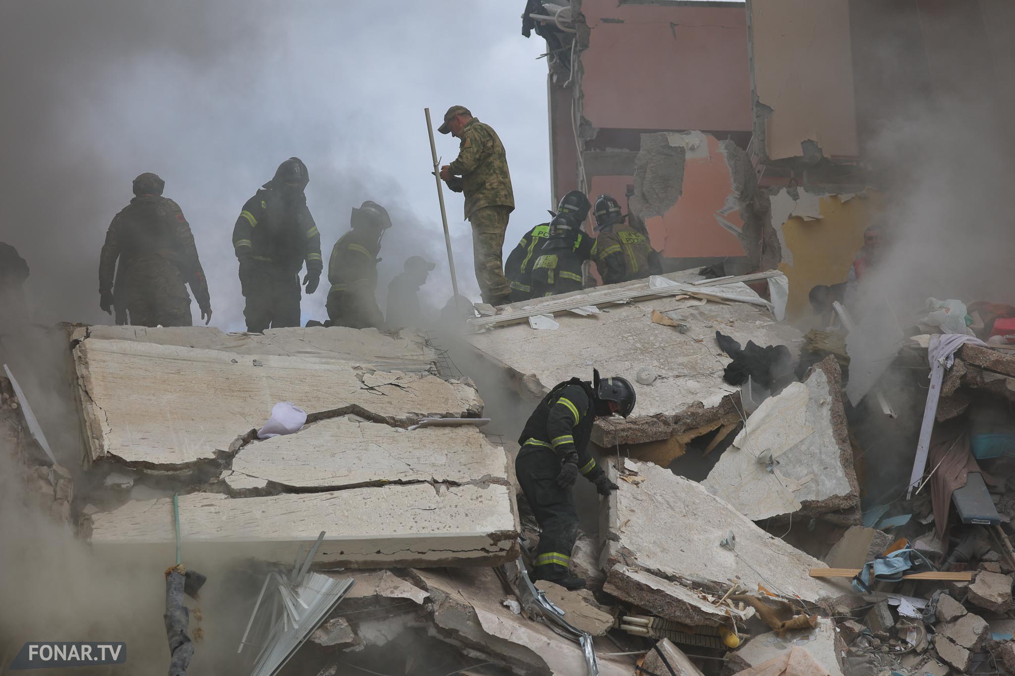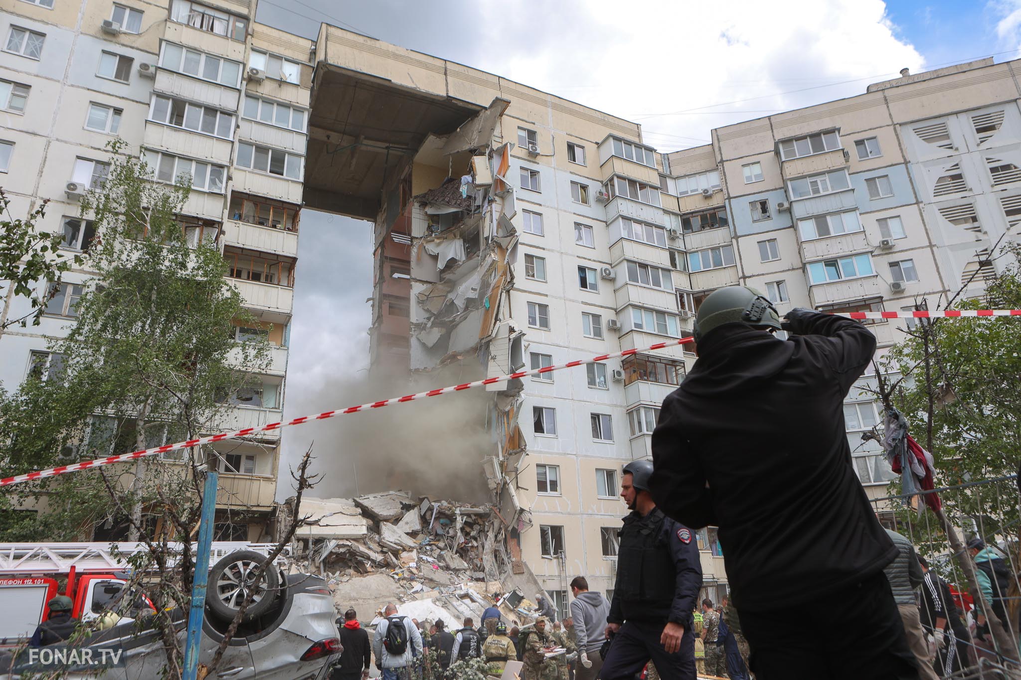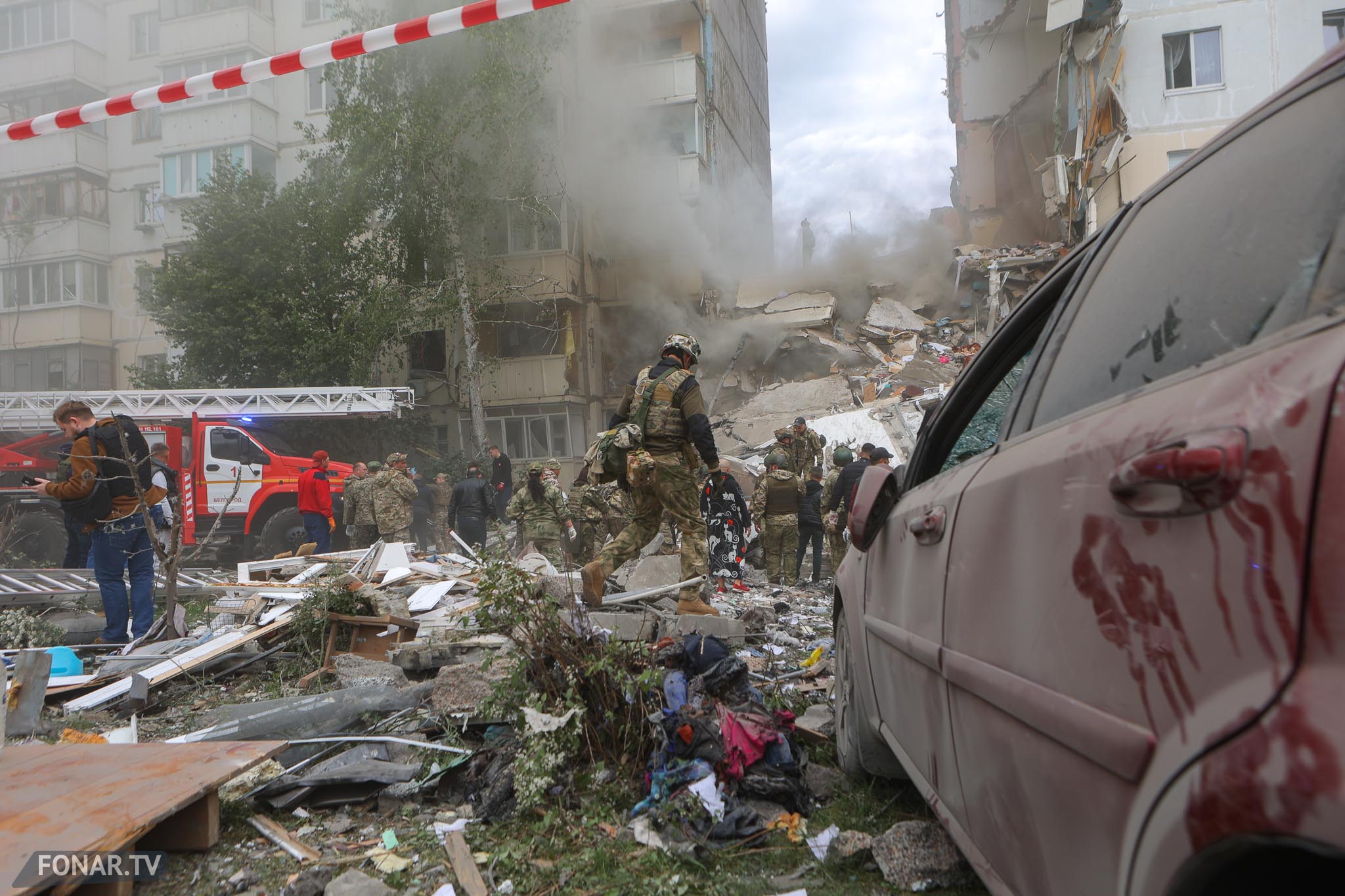 Родственники людей, живших в рухнувшем подъезде, со слезами на глазах ждали новостей о близких. Очевидцы, заикаясь, рассказывали о произошедшем по телефону. Люди из соседних домов уговаривали бойцов терсамообороны пустить их за вещами. Но с территории дома только выходили люди с чемоданами и испуганными животными на руках.