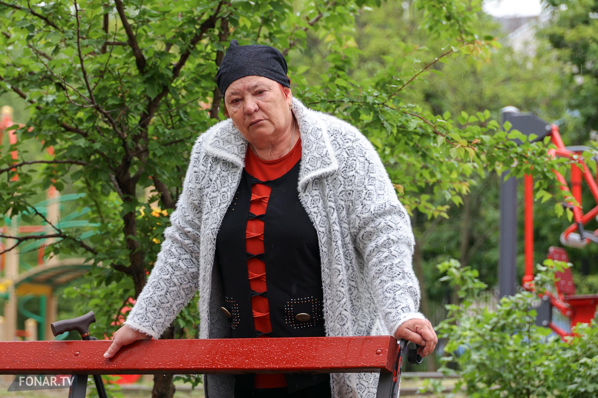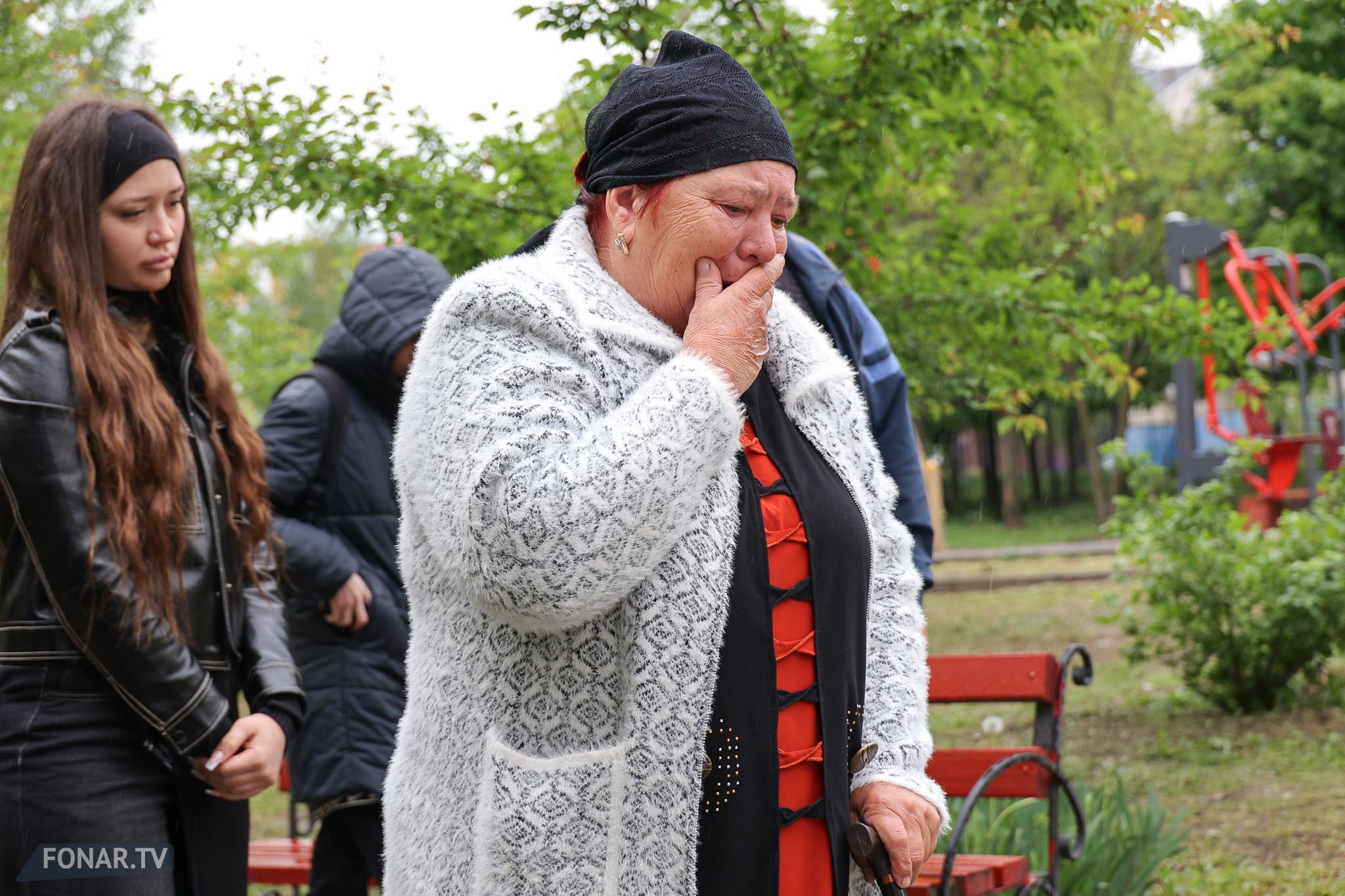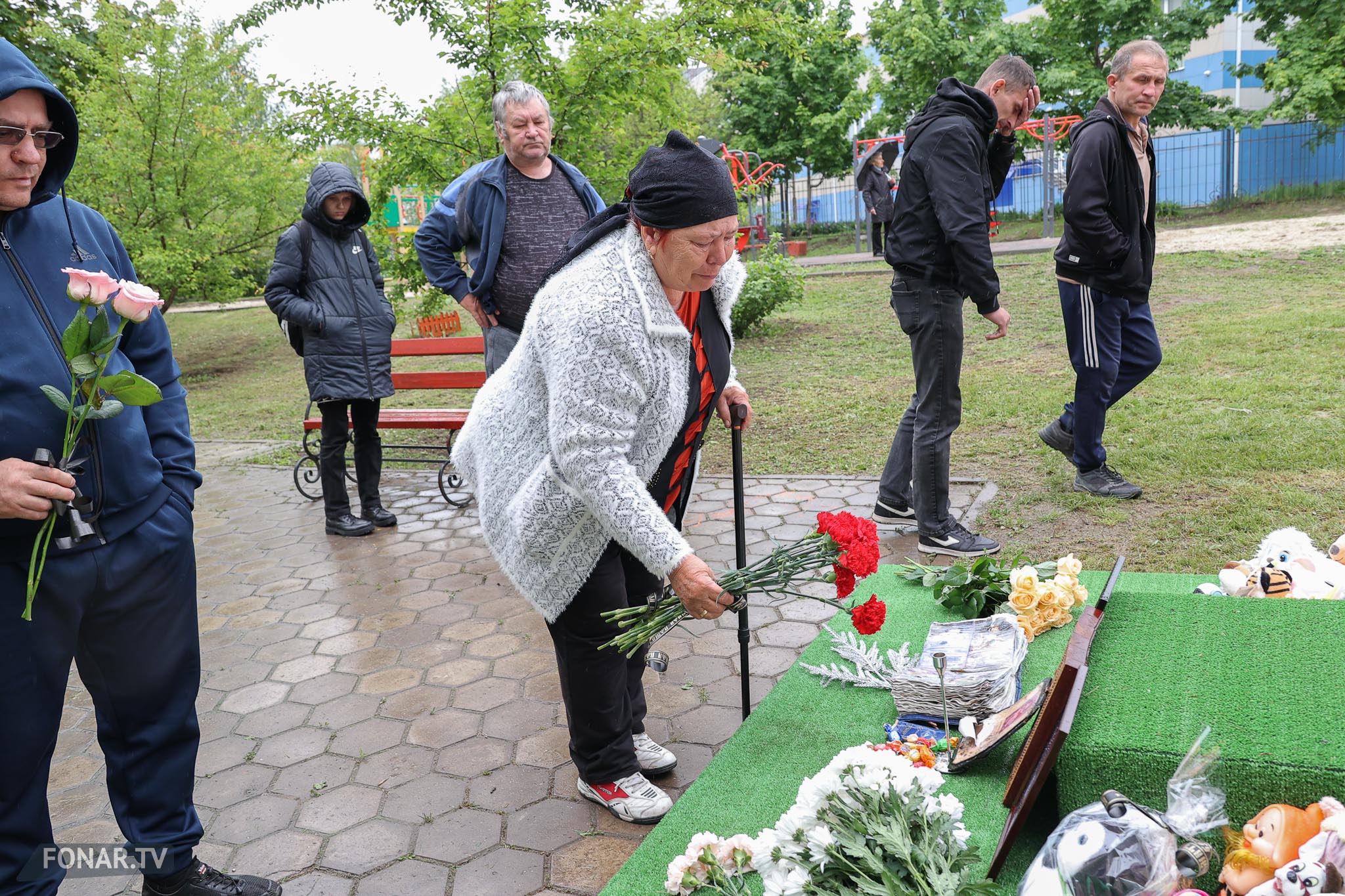 — Я день и ночь плачу. Вышла на балкон — и всё, гляжу на это. Так [погибших] не знала — знала в лицо. Здоровались, проходили, знали. И девочка эта, Аврора, она так в глазах у меня стоит, маленькая, — в глазах женщины в красном костюме появляются слёзы. — Ей лет восемь было. Она с мамой шла перед этим. Я видела — платьице такое красивое. Она здесь крутилась. Потом не стало. И мамы не стало.