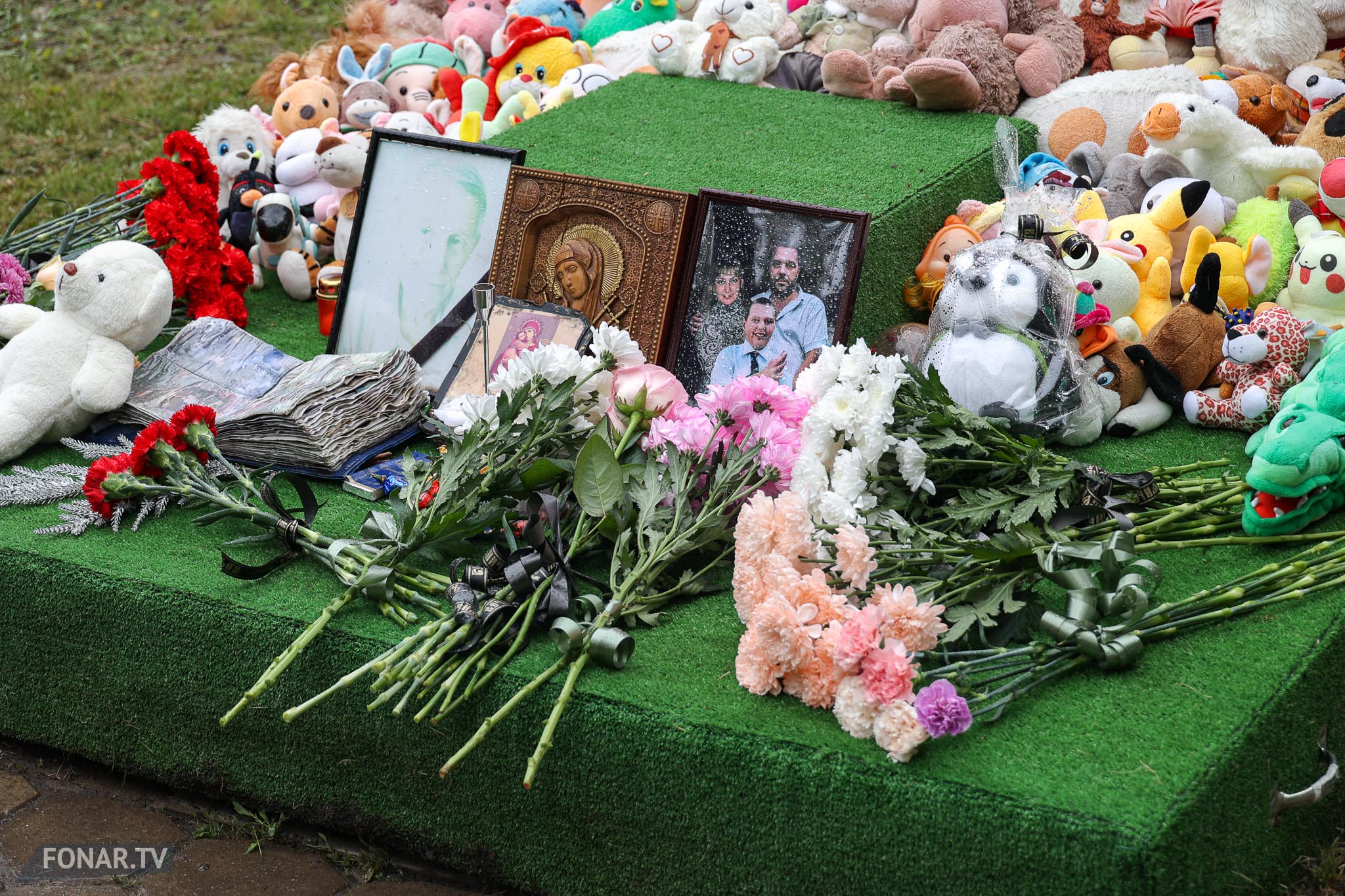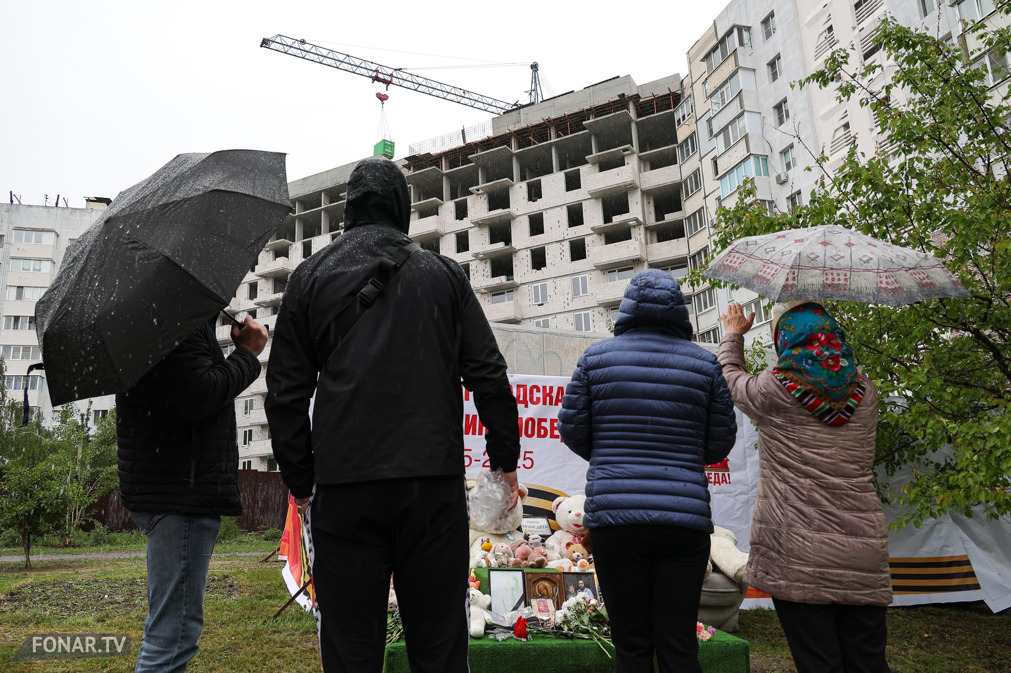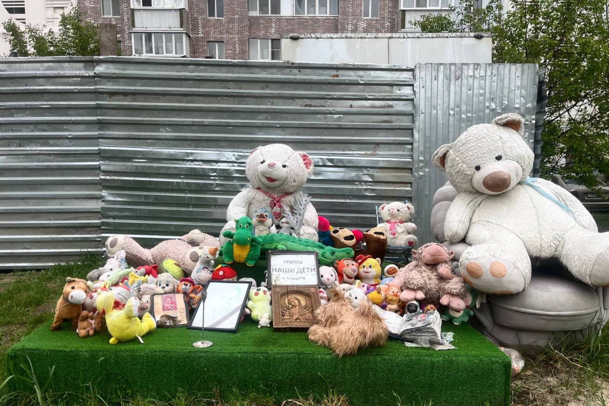 Напротив четвёртого подъезда, за серебристой бытовкой строителей, стоит зелёный постамент с искусственным газоном. На нём лежат мягкие игрушки. Их принесли родственники погибших и соседи. По словам местных жителей, близкие погибших периодически возвращаются к мемориалу.