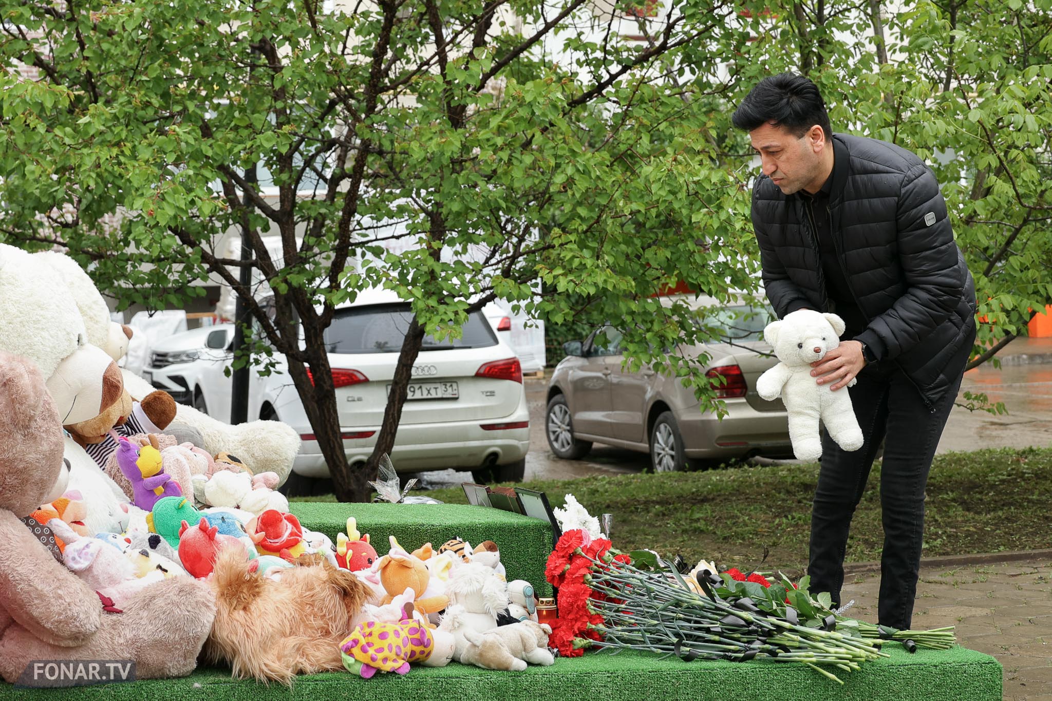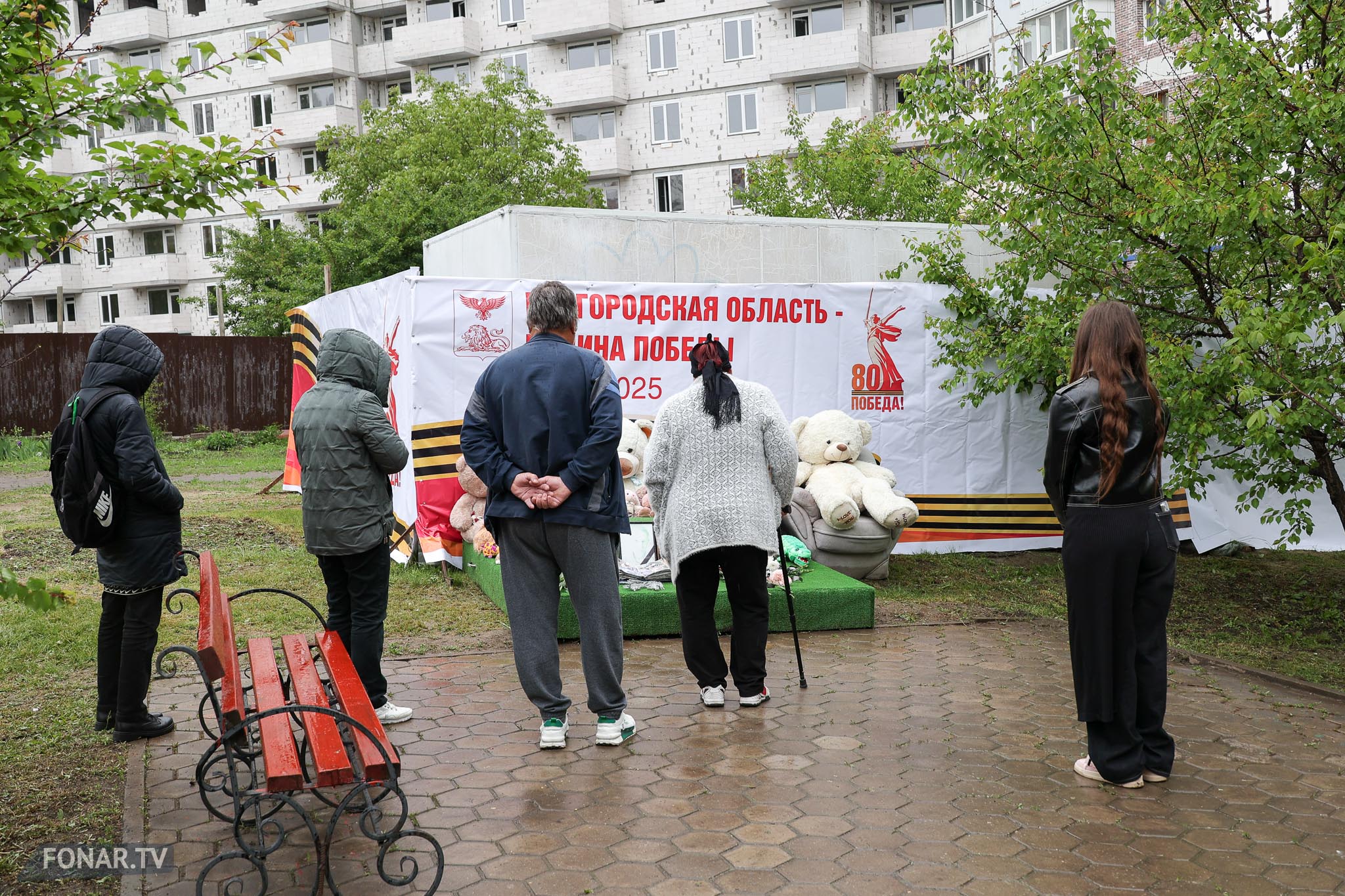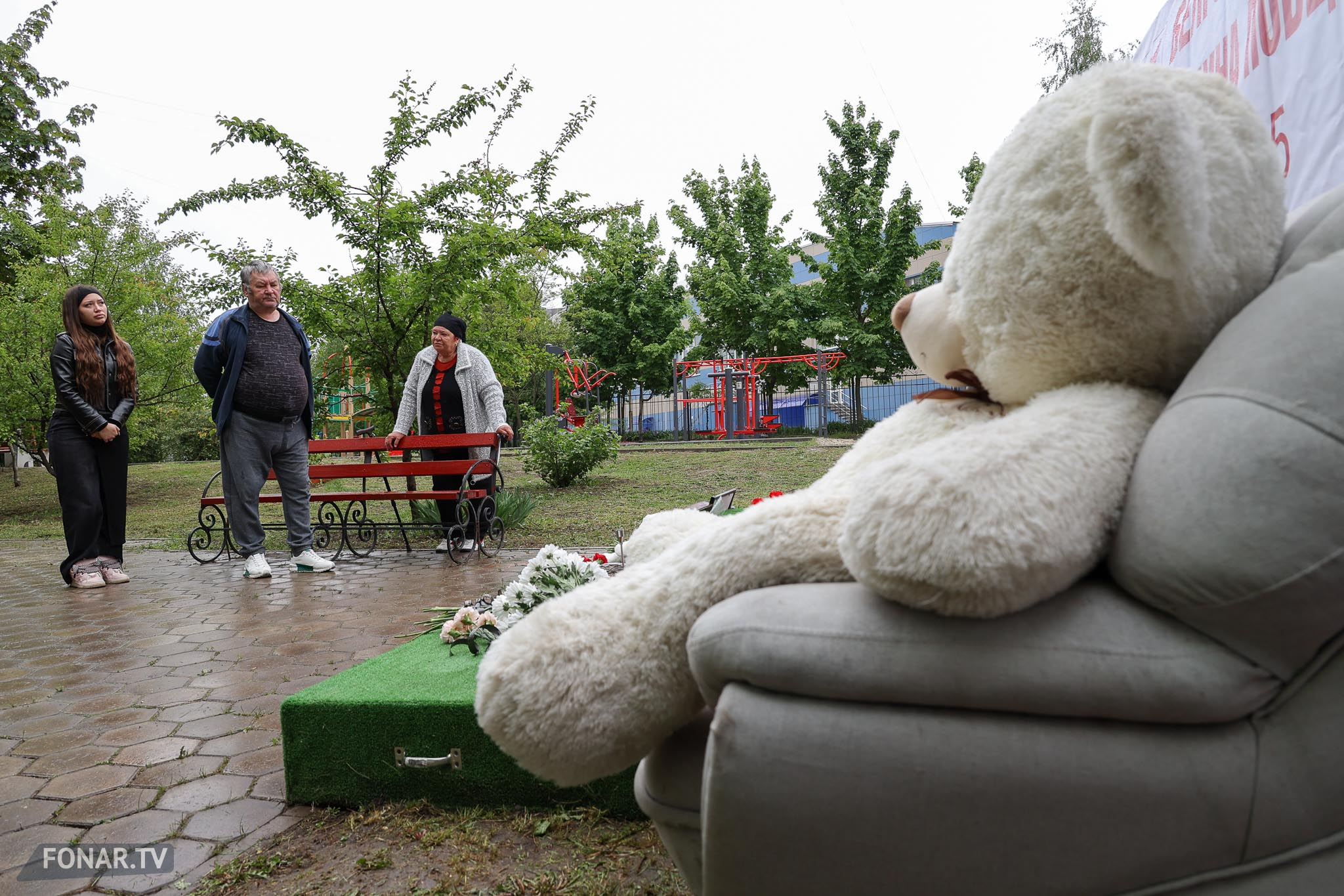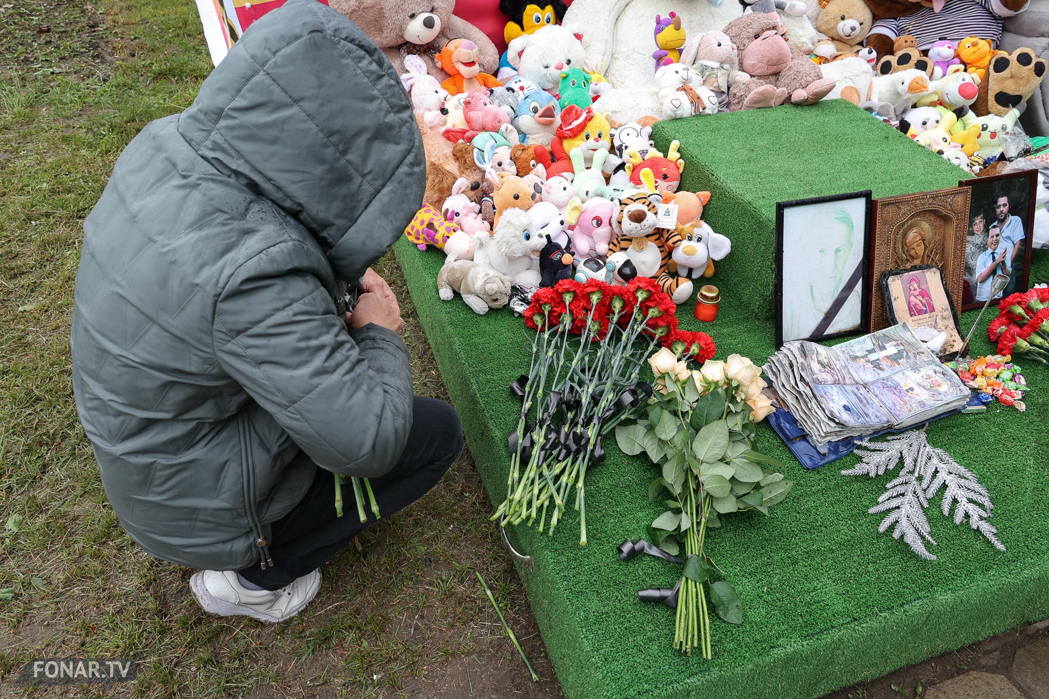 Напротив четвёртого подъезда, за серебристой бытовкой строителей, стоит зелёный постамент с искусственным газоном. На нём лежат мягкие игрушки. Их принесли родственники погибших и соседи. По словам местных жителей, близкие погибших периодически возвращаются к мемориалу.