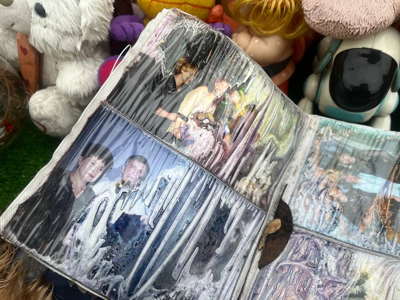 Игрушки не убирали даже зимой. Некоторые из них грязные. Среди плюшевых зверей, в рамке, стоит выцветший портрет пожилого мужчины с чёрной лентой. Рядом — деревянная икона Божией Матери и альбом. На фотографиях — улыбающиеся люди за семейными застольями. Но с каждой страницей лица всё сильнее расплываются: от дождей и сырости изображения превратились в цветные пятна — и люди исчезли даже в памятных фотографиях.