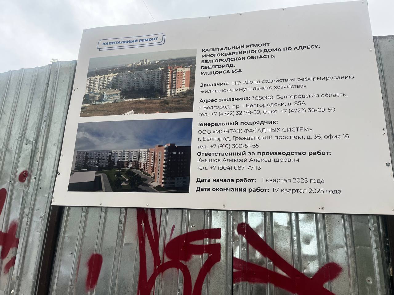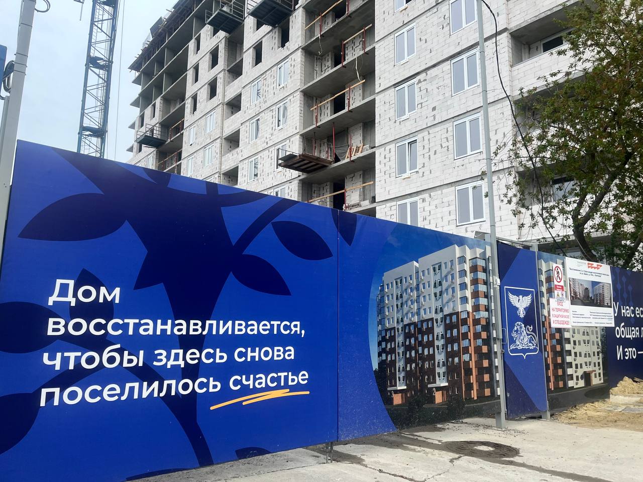 Рядом с баннером — изображение будущего дома с бело-бордовым фасадом. Пока подъезды сильно отличаются от изображения на картинке: серые стены, незастеклённые окна, верхние этажи ещё достраивают. Жителей должны заселить сюда к декабрю 2025 года. Забор закрыт, и пройти в дом могут только собственники жилья в пострадавших подъездах.