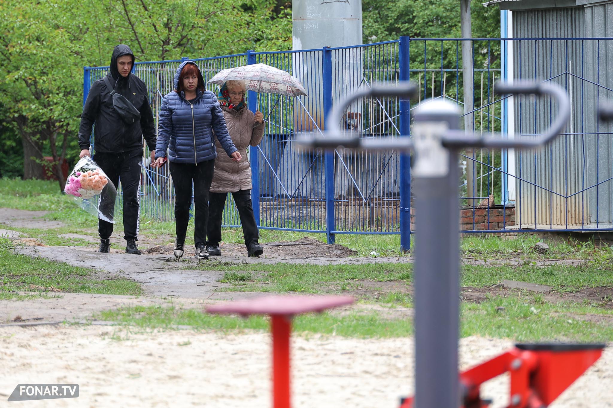 К пенсионерке в костюме подбегает её семилетний правнук, подходят две правнучки-школьницы. Они гуляли во дворе. После трагедии взрослые не отпускали детей гулять — боялись повторных обстрелов. Но спустя год на весь двор раздаются детский смех и крики. Дети бегают вдоль забора и играют на детской площадке у четвёртого подъезда.