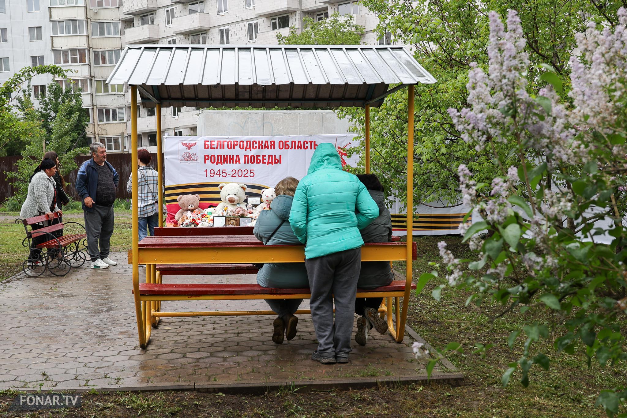 6 мая на всю территорию у образовательного центра «Луч» звучит весёлая музыка про день рождения. Две девушки танцуют рядом с укрытием, вместе с аниматором в костюме медведя во фраке и шляпе. Прохожие неспешно идут мимо по аллее с цветущими тюльпанами. В Белгороде — майский закат.