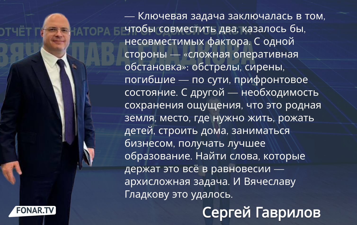 Мы попросили депутата Госдумы от Белгородской и Воронежской областей Сергея Гаврилова прокомментировать отчёт губернатора. Гаврилов тоже был в зале, когда Гладков отчитывался о работе в 2024 году.