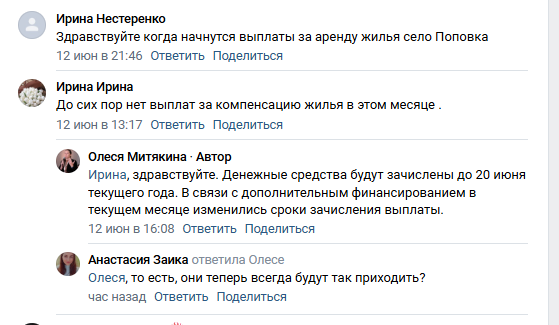 — Вначале говорили, что до 12 мая [перечислят]. Потом заверили, что в первых числах июня. Да сколько можно всё выклянчивать? Когда это всё прекратится? Мы не на добровольной основе покинули свой дом. Потом тот [дом], что снимали в Яруге, — написала в комментариях 9 июня Наталья Василенко.