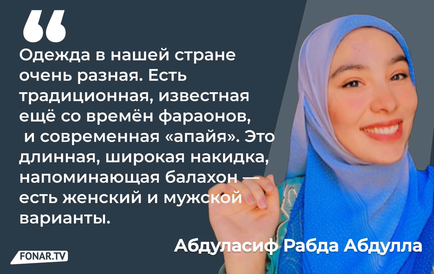 Одежда в нашей стране очень разная. Есть традиционная, известная ещё со времён фараонов, и современная «апайя». Это длинная, широкая накидка, напоминающая балахон — есть женский и мужской варианты. Отличия у них заключаются в том, что у женщин она более широкая, а у мужчин — наоборот, узкая и приталенная по фигуре. Такая накидка не нарушает давних традиций и является даже более удобным вариантом на каждый лень. И, конечно, есть хиджаб — традиционная накидка, которую продолжают носить абсолютно все женщины.