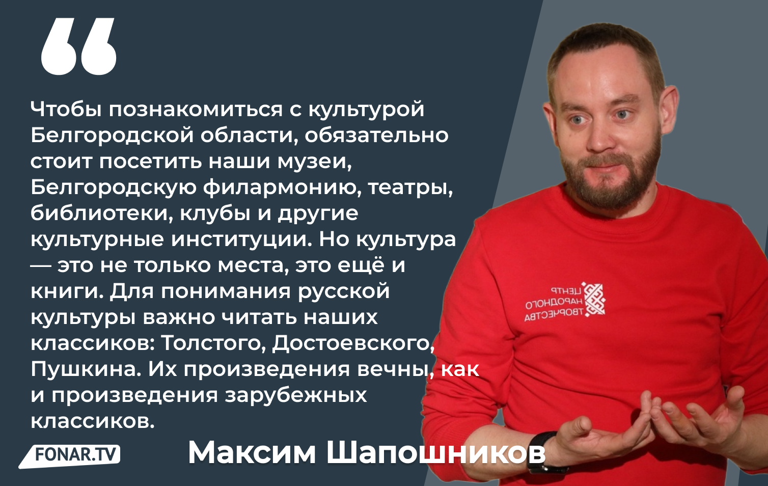 Чтобы познакомиться с культурой Белгородской области, обязательно стоит посетить наши музеи, Белгородскую филармонию, театры, библиотеки, клубы и другие культурные институции. Но культура — это не только места, это ещё и книги. Для понимания русской культуры важно читать наших классиков: Толстого, Достоевского, Пушкина. Их произведения вечны, как и произведения зарубежных классиков.