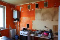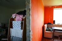 Стены в кухне и ванной выкрашены краской в пожарно-оранжевый, в комнате одна стена зелёная – «дизайнерские решения нынешнего года», до этого были обои. Говорит, понравился оранжевый, вот и решили закрасить. На кухне он уже начал облупляться, выдавая ошибки неумелых ремонтников в подготовке стен. В комнате начали было красить стены, но потом решили, что лучше всё же обои. На этом ремонт остановился.