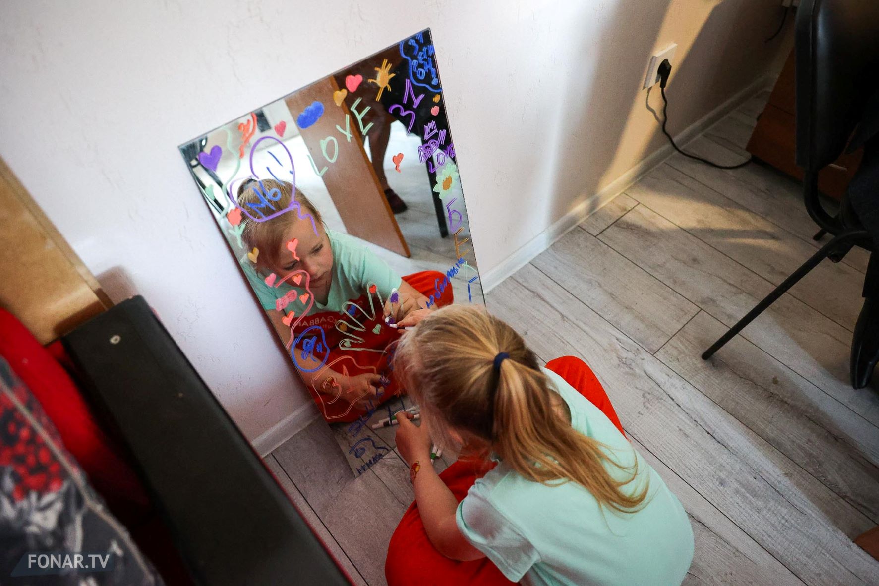 Комната заполнена детьми. Одни девочки за большим столом разукрашивают картинки, другие рисуют на зеркалах и фотографируются.