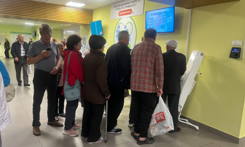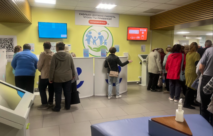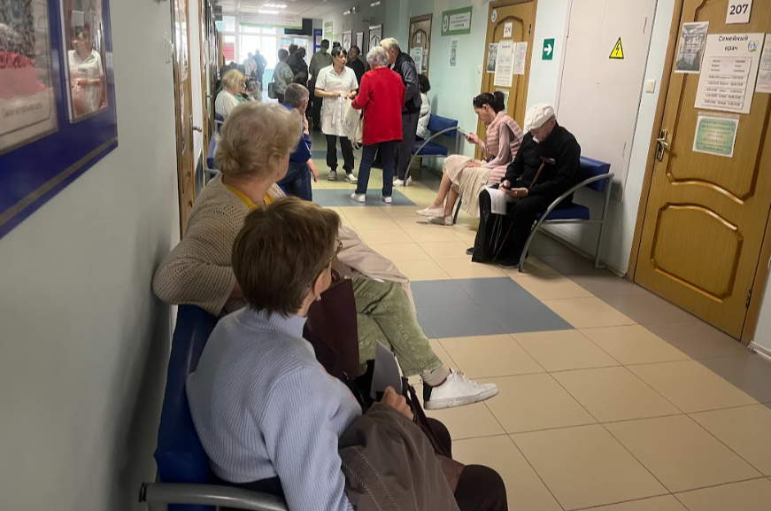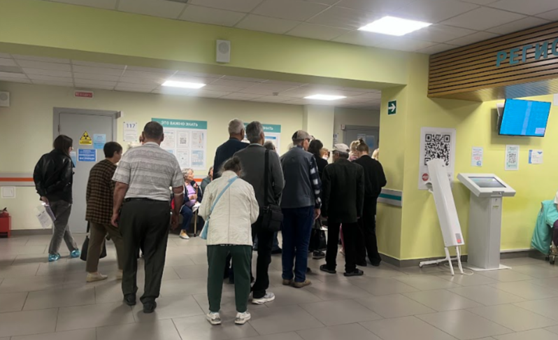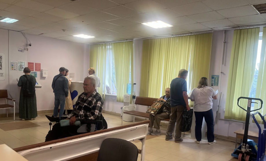 В коридорах поликлиники на улице Есенина, разговоров больше про СВО и кажется, самая большая очередь к терапевтам. Люди не только в коридоре, но даже на площадке у лифта.