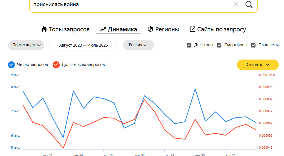 В апреле 2025 года сервис показал новый пик запросов в Белгородской области — информацию о снах про [Роскомнадзор] искали около 50 раз. В регионе рекордное число раз — 22 — вводили поисковый запрос «приснилось СВО». Рост запросов виден в Курской и Воронежской областях, в Сибири, на Дальнем Востоке и на Северном Кавказе. В Сибири — почти 800 запросов, на Дальнем Востоке — больше 300.