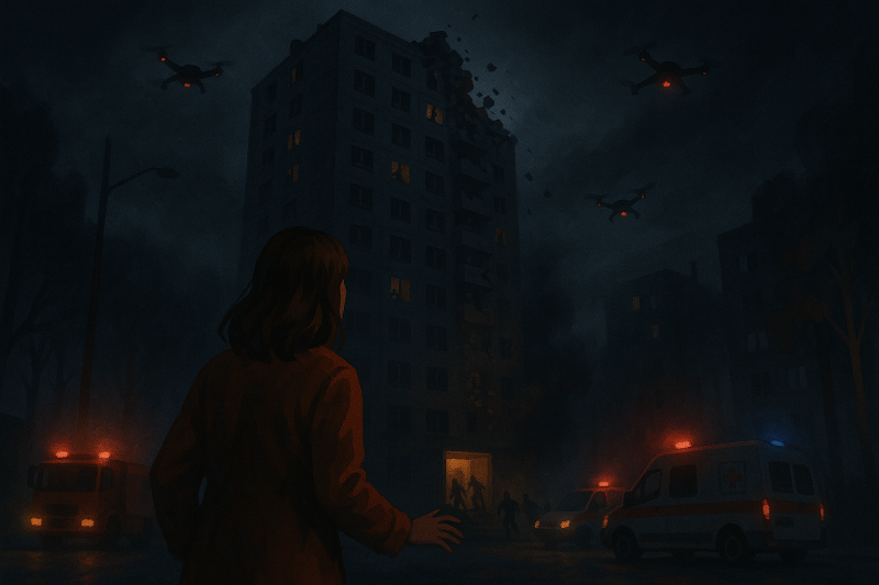 Самый странный сон Надежды. Читать↓Во сне девушка с родителями и сестрой стояли во дворе возле центральной площади Курска. Они наблюдали за толпой счастливых людей, которые пришли на праздник. Надежда чувствовала радость: это напомнило ей о временах до начала СВО. Внезапно Надежда увидела огромный летающий самолёт-беспилотник. Он начал стрелять по площади. Девушка и её близкие спрятались. Когда самолёт улетел, они выбрались и увидели, что на площади все погибли. Надежда с семьёй добралась до машины. Они поехали в сторону дома. По пути она видела, как в городе приземлились вертолёты. Из них вышли люди в касках, очках и чёрной одежде. Они расстреливали людей на улицах и подорвали мост. Но семья Надежды успела проехать по мосту в свой район. Небо в части города, откуда они уехали, осталось серым и туманным, раздавались взрывы. В районе, куда семья приехала, было ясное небо. |