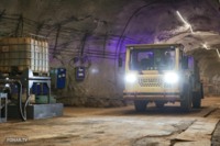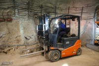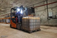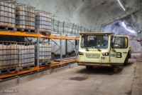 Побывали мы на складе эмульсионно-взрывчатых веществ. Отсюда эмульсию, необходимую для работы, забирают на погрузчиках — похожих на те, что можно встретить в супермаркетах.