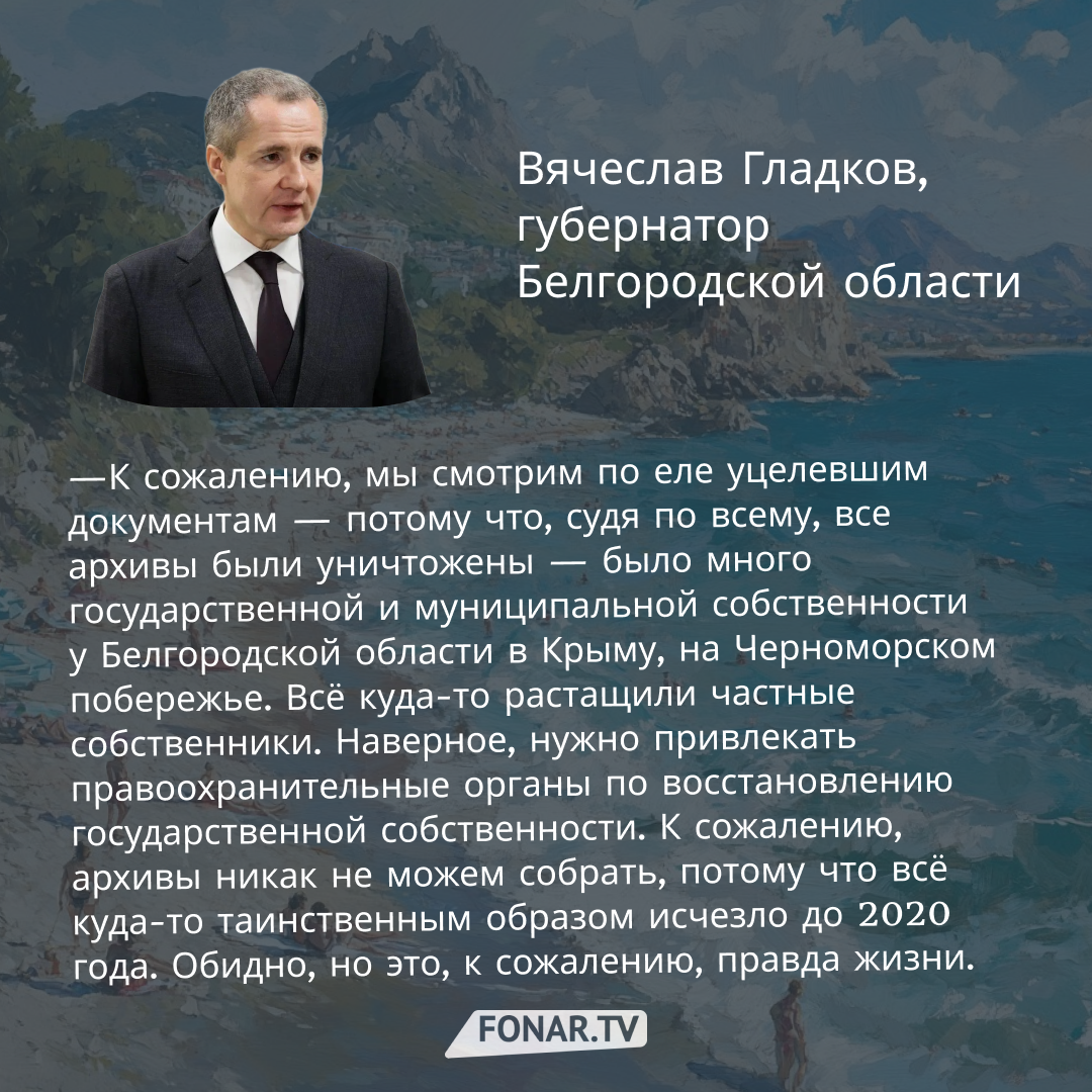 Зимой 2025 года губернатор Вячеслав Гладков на оперативном совещании заявил, что раньше в государственной и муниципальной собственности региона было гораздо больше имущества на территории Крыма, однако всё растащили частные собственники, а записи в архивах исчезли.