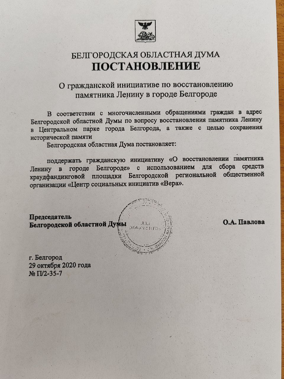 Сбор денег на восстановление памятника Владимиру Ленину стартовал по инициативе Белгородской областной Думы в 2020 году. Центру социальных инициатив «Вера» передали готовый пакет информации для проведения сбора средств: «Мы ничего не добавляли и не убавляли — разместили всё, как прислали. Мы администрируем — у нас много выполненных проектов, деньги по факту сразу перечисляем исполнителю», — объяснила «Фонарю» руководительница Центра социальных инициатив «Вера» Лениза Умеркина.