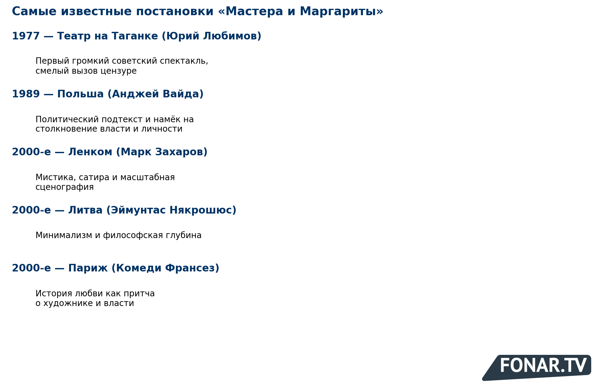 Юрий Любимов и Театр на Таганке (1977 год) — первая громкая советская постановка. Любимов решился на инсценировку ещё при жизни Булгакова, но только в 70-е спектакль был представлен на сцену. Он стал событием и вызовом: мистический роман в советском театре звучал как вызов цензуре.