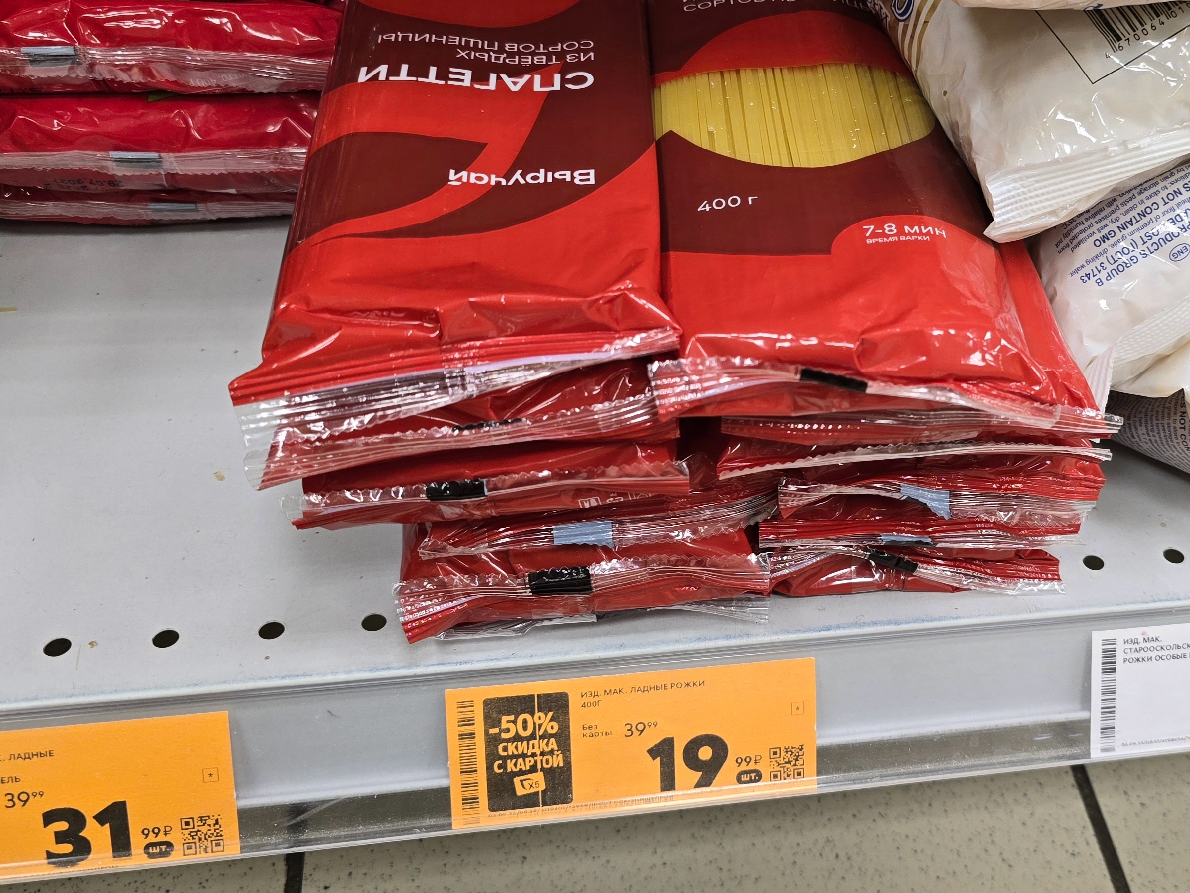 - Макаронные изделия из муки твёрдых сортов пшеницы (группа А), 99,97 руб. — в наличии, продаётся по 400 грамм.