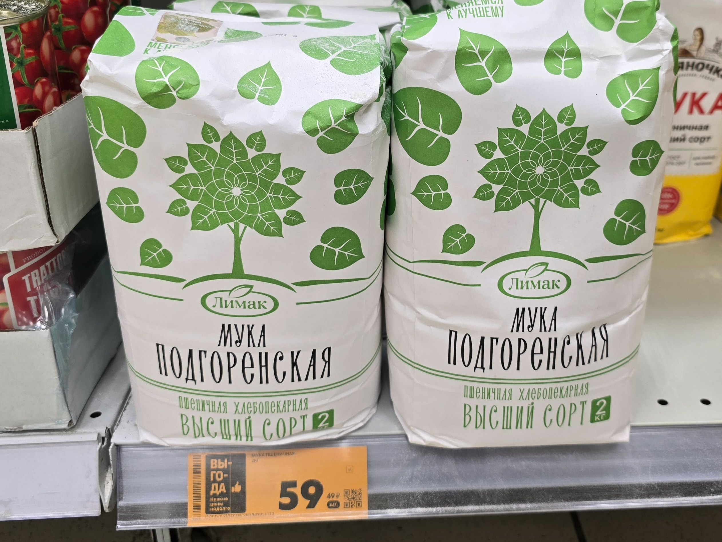 Магазин «Пятёрочка», Белгород, улица Победы, 71- Мука пшеничная, высший сорт, 29,74 руб./кг — в наличии, продаётся по 2 килограмма.