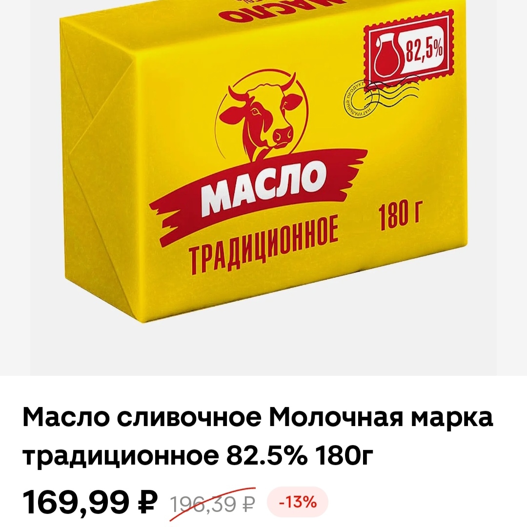 - Масло сливочное 72,5% м.д.ж., 806,61 руб./кг, — отсутствует. Самое дешёвое масло в магазине стоит 938,89 рубля за килограмм.