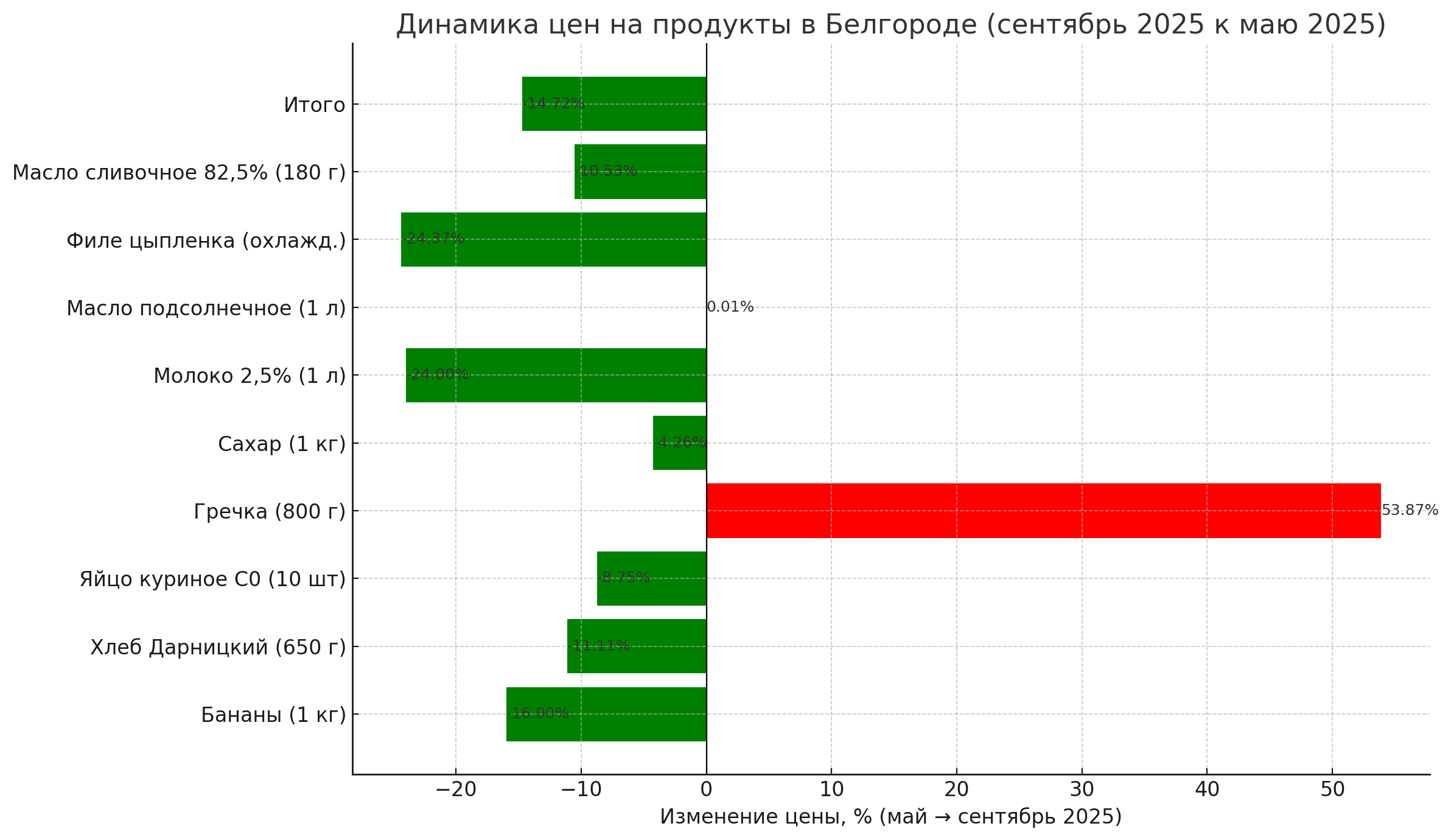 При этом один продукт из нашего списка существенно подорожал: цена на гречневую крупу выросла на 12,6 рубля, что составляет значительные +53,87 процентов по сравнению с ценой в мае. А вот подсолнечное масло подорожало всего на одну копейку. Общая стоимость нашей продуктовой корзины снизилась на 186,18 рубля — на 14,72 процента. Если в мае продукты из списка можно было купить за 1 265 рублей, то в сентябре — за 1 078 рублей.