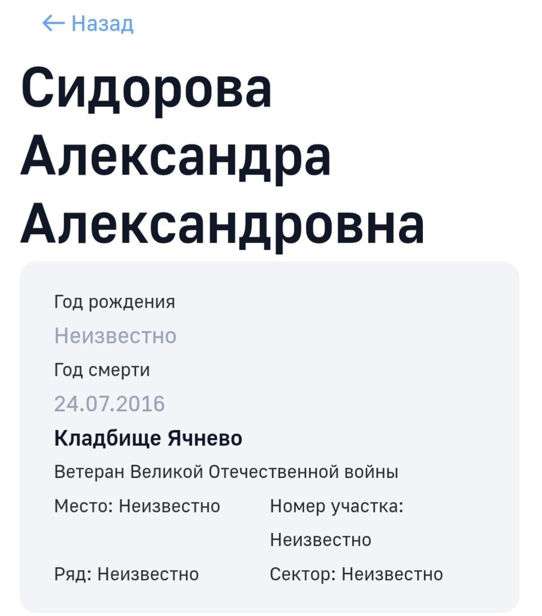 Сервисов вроде уборки и возложения цветов на могилу в обновлённом проекте нет. Там можно найти только подтверждение, что ваш родственник похоронен на кладбище Ячнево, его ФИО и даты жизни, а если повезёт — ещё и фотографию могилки. Собственно всё. Даже расположение захоронения не узнать. По крайней мере на настоящий день.