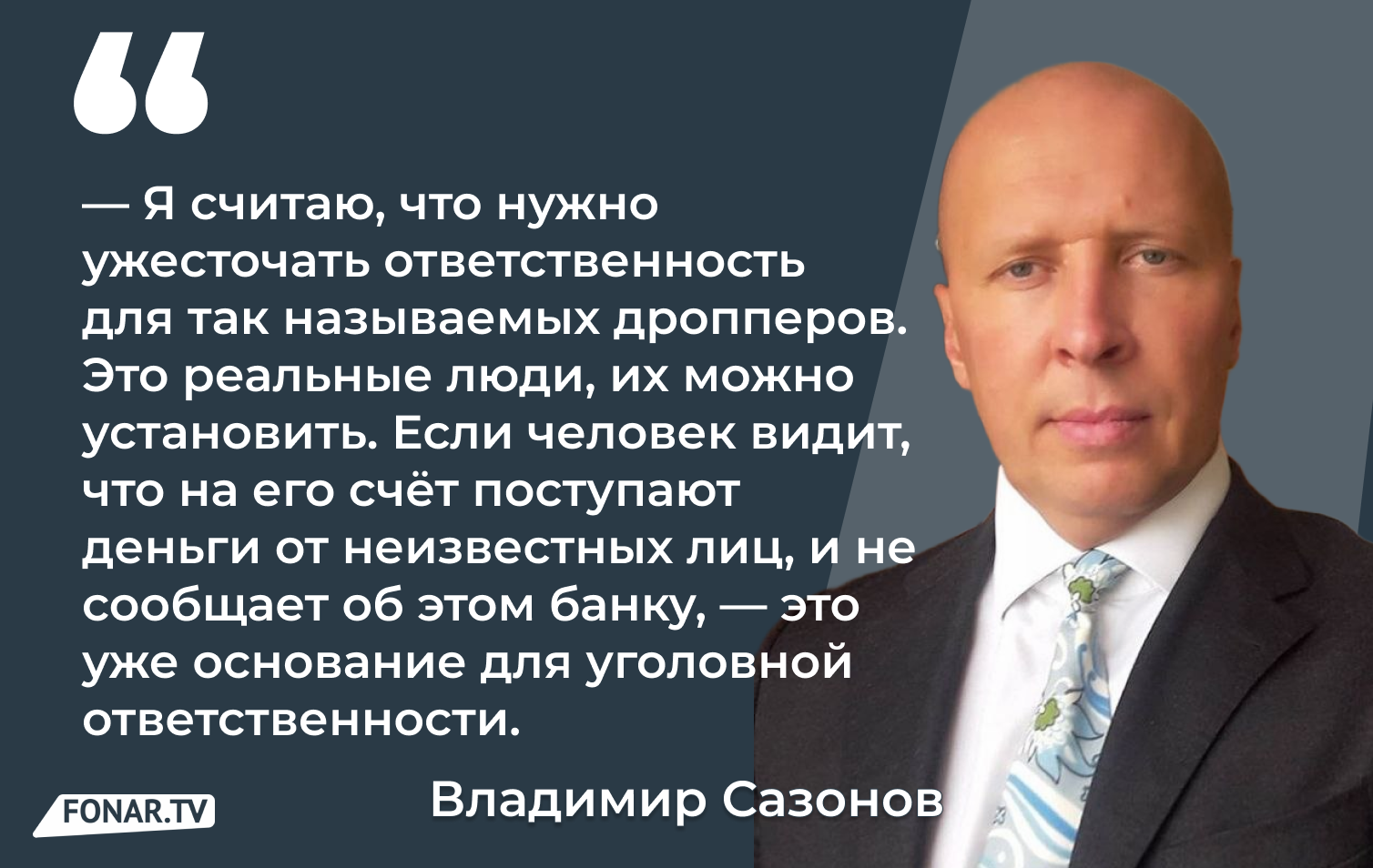 Я считаю, что нужно ужесточать ответственность не только для организаторов, но и для тех, кто предоставляет свои банковские карты для обналичивания денег — так называемых дропперов. Это реальные люди, их можно установить. Если человек видит, что на его счёт поступают деньги от неизвестных лиц, и не сообщает об этом банку, — это уже основание для уголовной ответственности.
