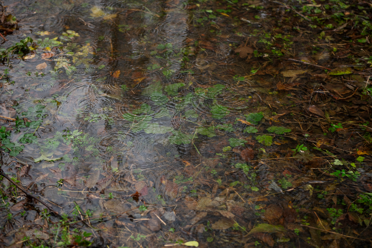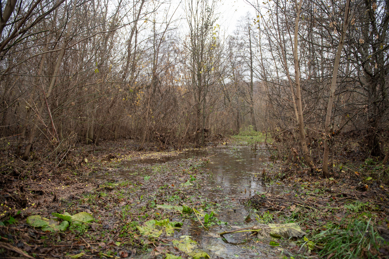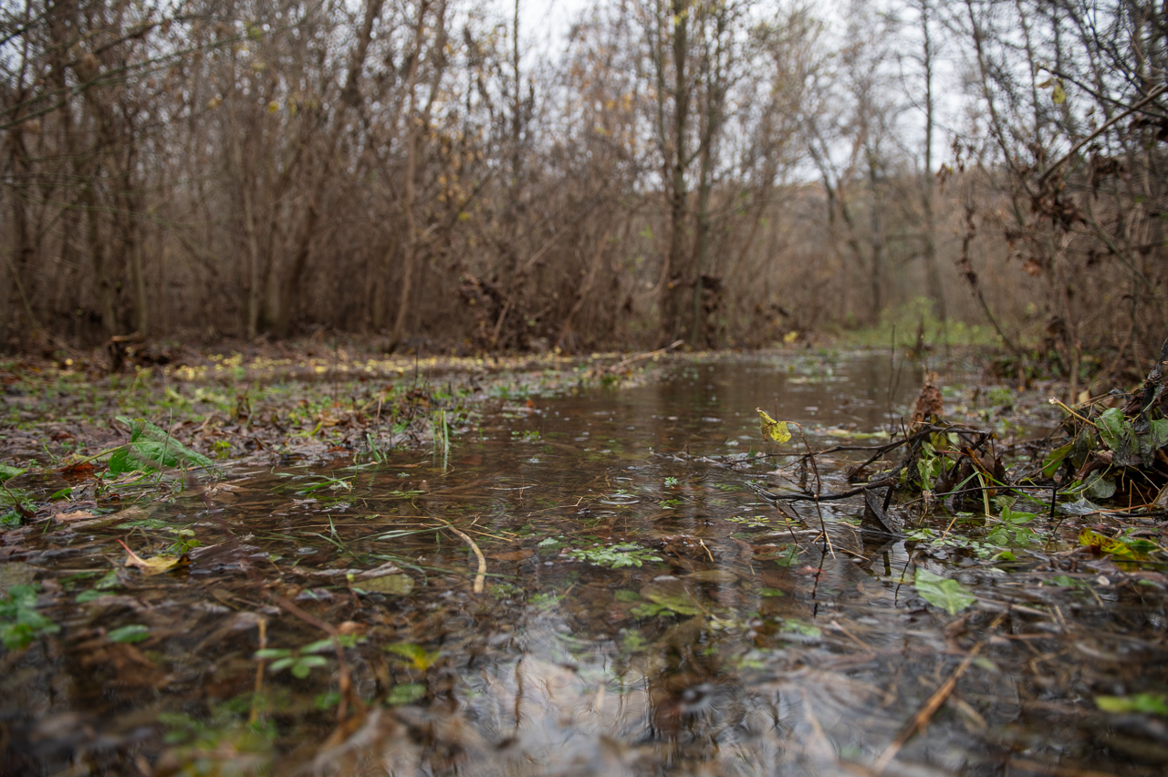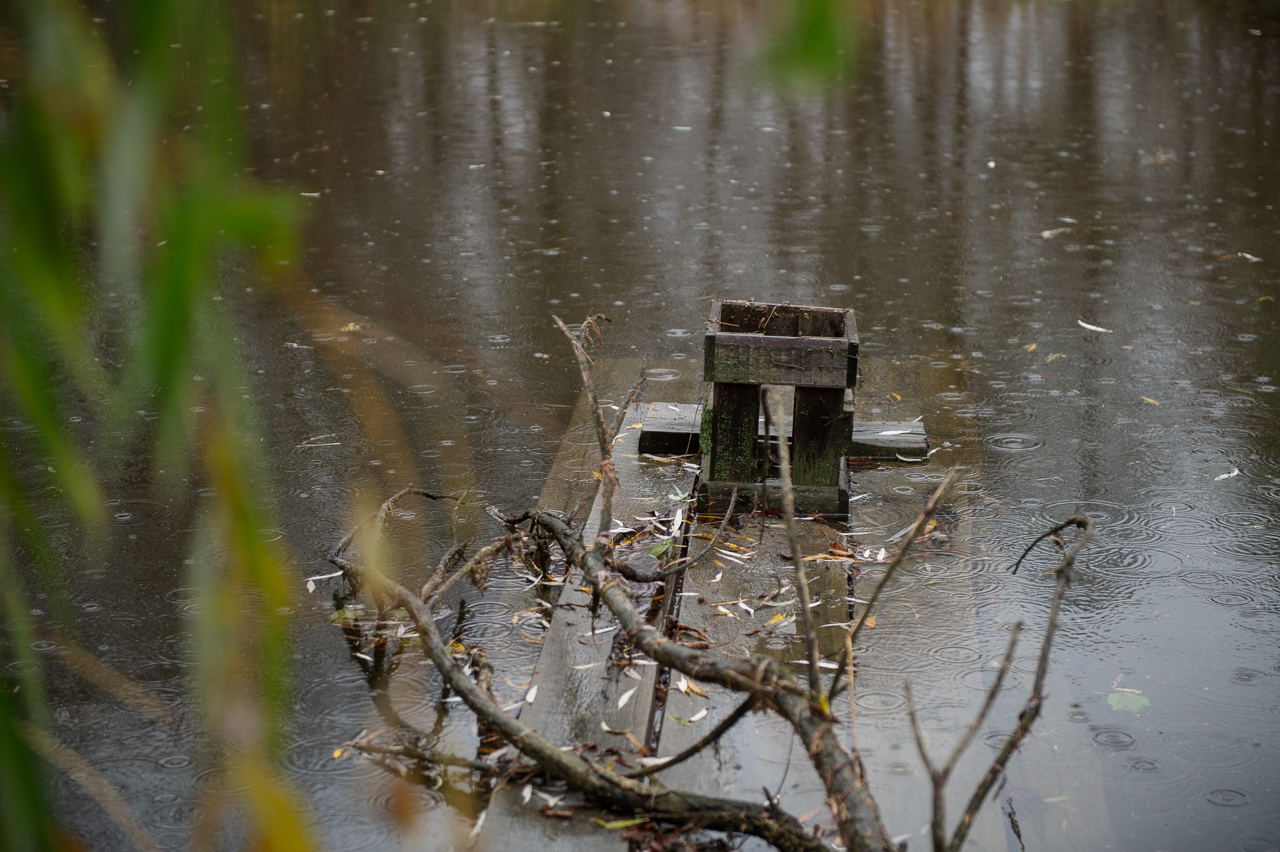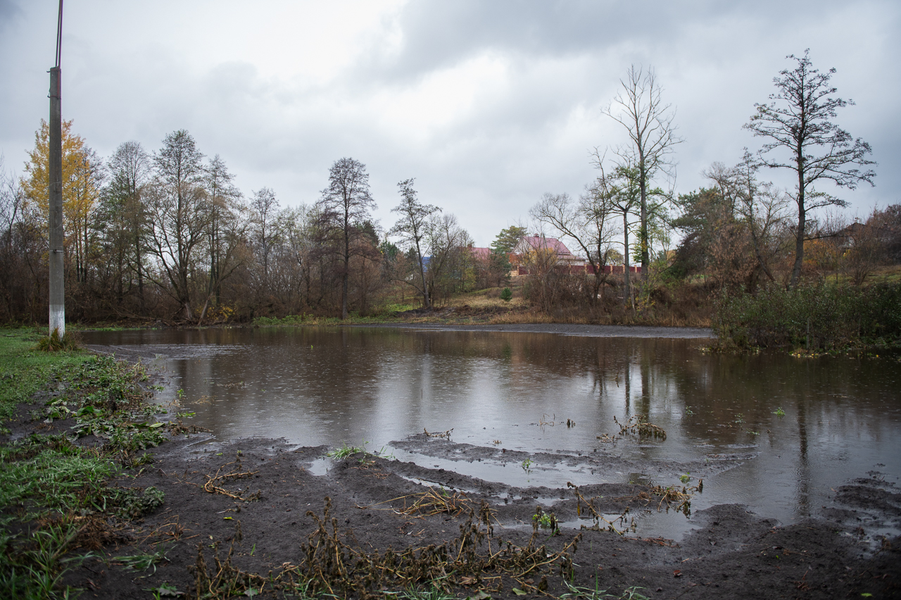 Мы спускаемся на машине вниз от улицы Победы на небольшой участок земли с высокой мокрой травой. Она приминается под нашими ногами, а земля чавкает. То, что мне поначалу показалось островком, разделяющим реку на две части, оказывает небольшим прудом и разлившейся водой из водохранилища. Если смотреть на онлайн-карте, река должна находиться гораздо ниже, а справа от меня — должна быть земля. Вживую широкий и кажущийся глубоким водоём не выглядит так, будто он появился несколько дней назад.