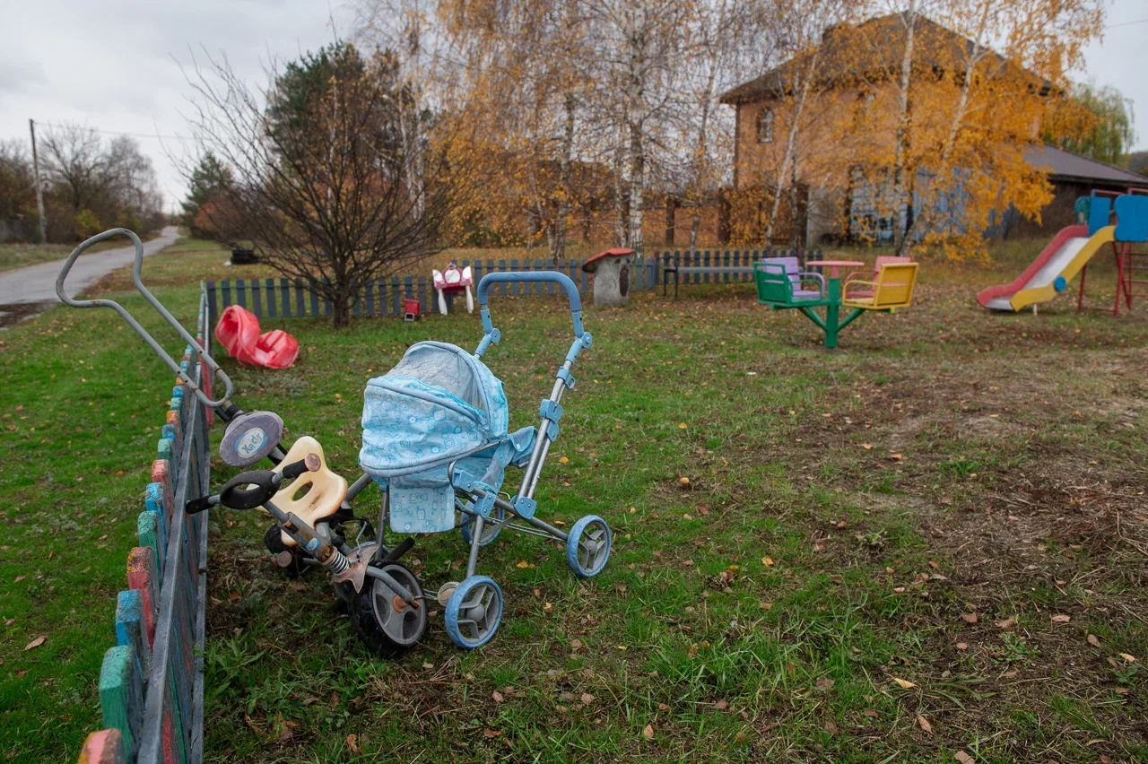 Ниже магазина, на улице Победы выделяется пустующая детская площадка с небольшой горкой, разноцветными качелями и песочницей. Возле невысокого забора одиноко стоят игрушечная голубая коляска и детский велосипед.