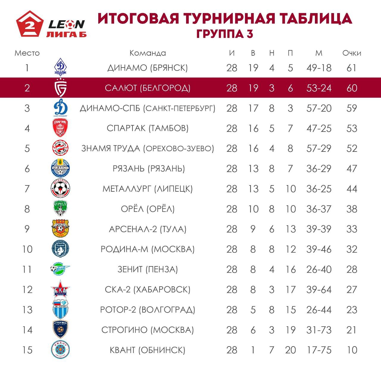 Любой же другой исход лишал белгородскую команду такой возможности и выводил на первое место главного преследователя — брянское «Динамо». В турнирной таблице динамовцев и «салютовцев» разделяло между собой два очка — 60 против 58. Какой же получилась в итоге развязка сезона, расскажем далее.