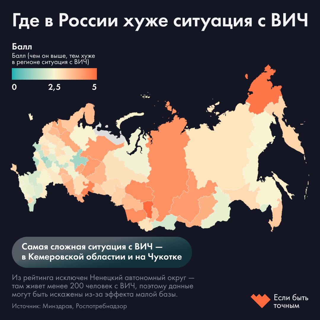 Медиа «Если быть точным» приводит такие данные о распространении и выявлении болезни: за 2024 год на ВИЧ протестировали почти 54 миллиона — 37 процентов населения. И это на семь процентов больше, чем годом ранее. Выяснилось, что только каждый 50-й из протестированных принадлежит к уязвимым группам, хотя среди них ВИЧ выявляется в разы чаще. Наиболее благоприятная ситуация с ВИЧ в Липецкой, Кировской и Белгородской областях — заболеваемость низкая, охват лечением высокий. А самые высокие показатели новых случаев — в Чукотском АО, Иркутской и Самарской областях.