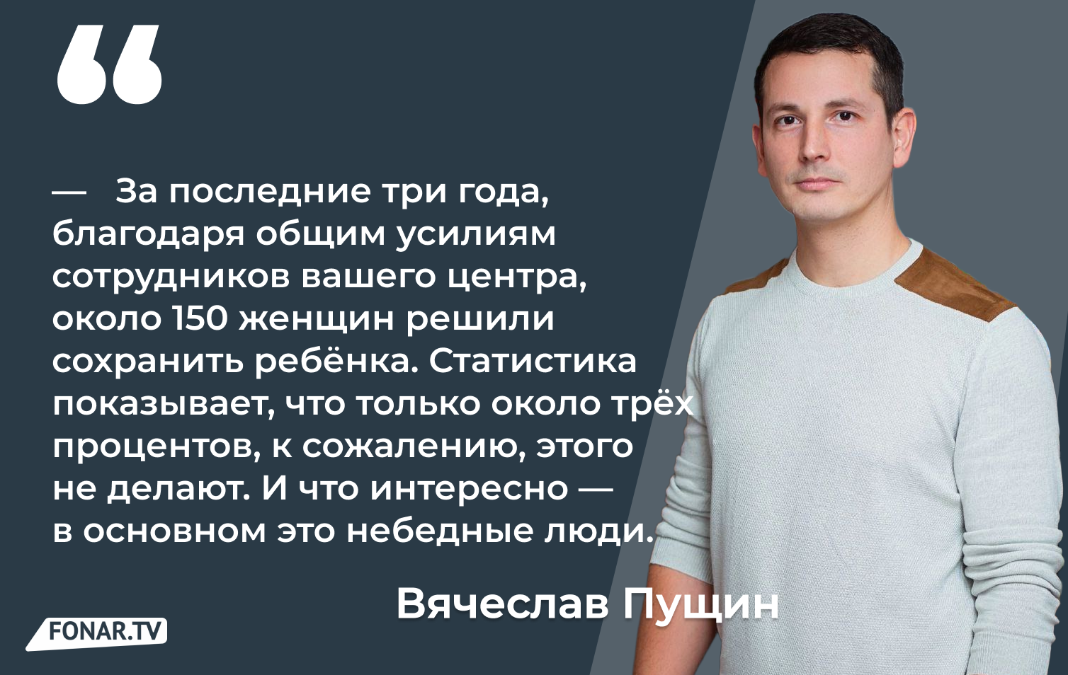 Журналист «Фонаря» Александр Журавлёв поговорил с директором кризисного центра помощи беременным женщинам «Сохрани мне жизнь», отцом четырёх детей Вячеславом Пущиным о том, почему женщинам бывает трудно принять решение родить ребёнка.