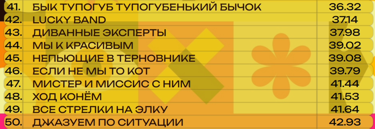 По итогам 59-й игры сильнейшими в очередной раз стала команда «Фонарь» — 73 очка в командном багаже. Два балла победителям уступил коллектив «Имени меня». Столько же очков набрала команда «Т9», ставшая третьей. В итоге она уже второй раз подряд зарабатывает бронзу.