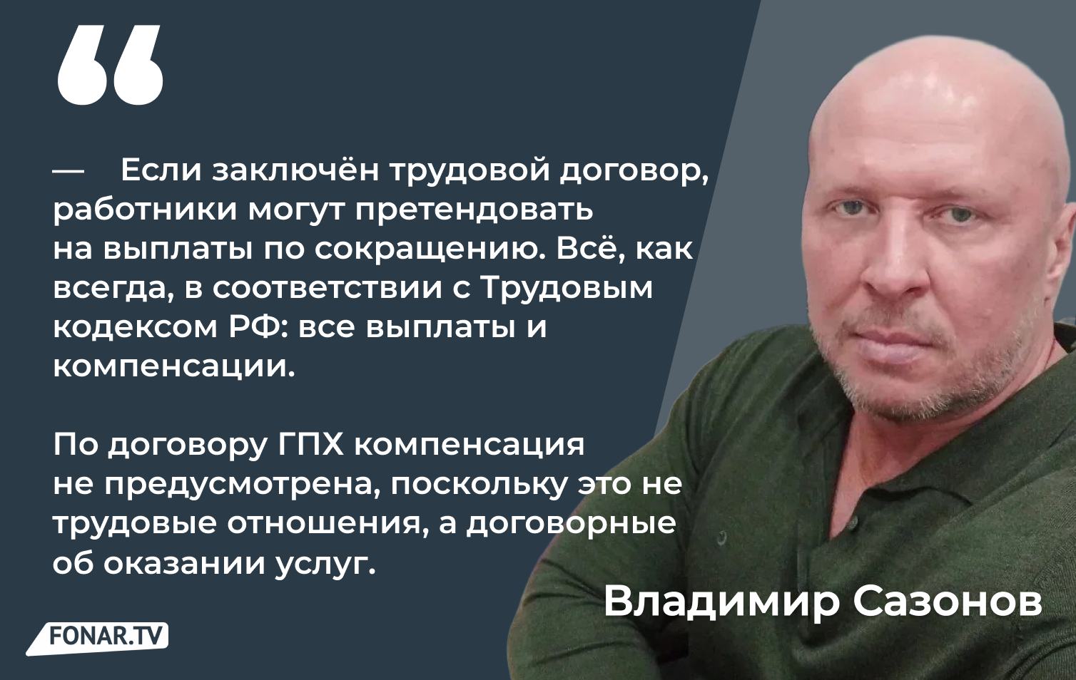 — Если заключён трудовой договор, работники могут претендовать на выплаты по сокращению. Всё, как всегда, в соответствии с Трудовым кодексом РФ: все выплаты и компенсации. По договору ГПХ компенсация не предусмотрена, поскольку это не трудовые отношения, а договорные об оказании услуг, — рассказал он.