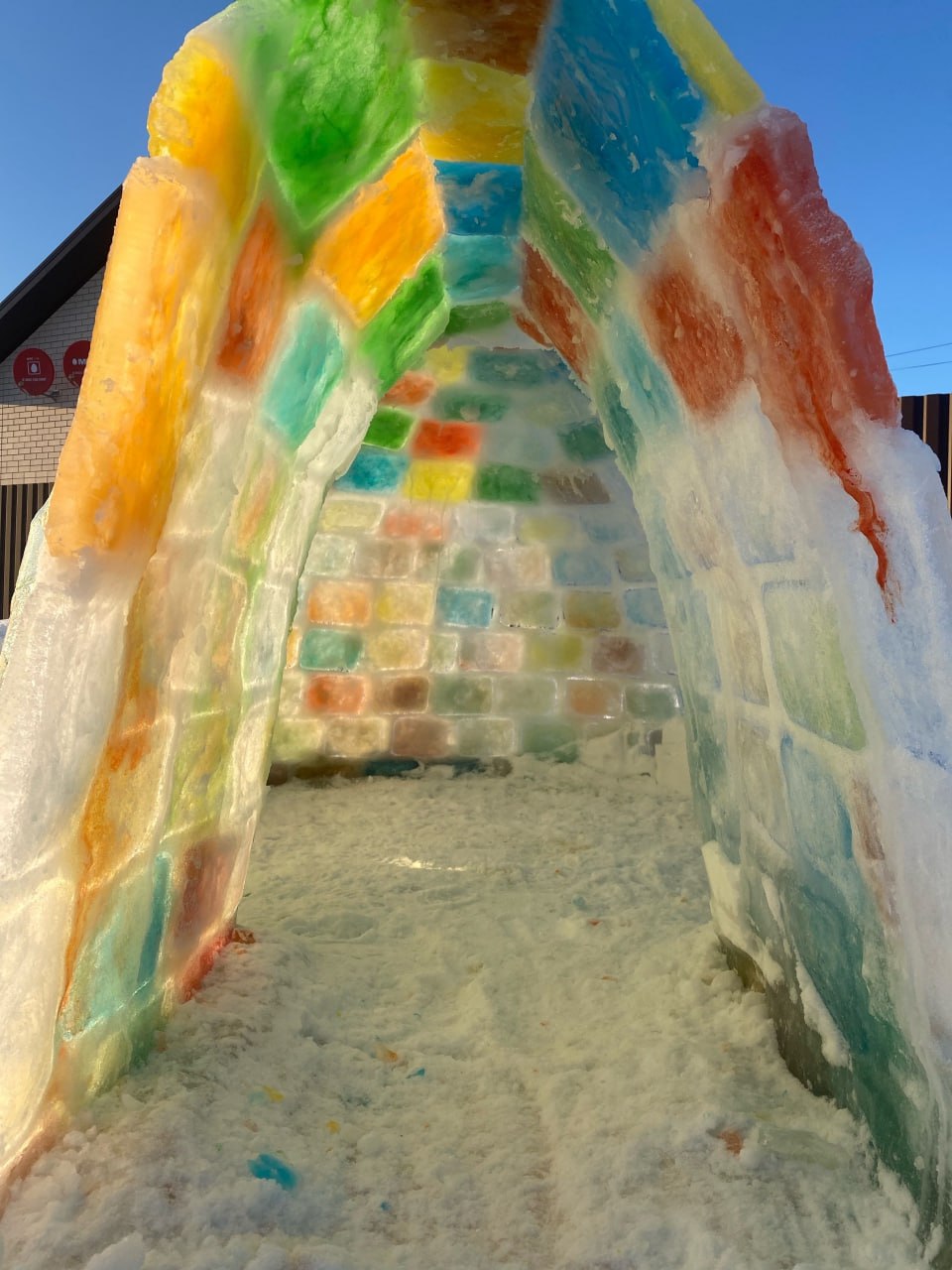 — Я приобрёл в магазине алюминиевые формочки для запекания и пищевые красители. Смешали краситель с водой и залили формы. Изначально у меня было 40 таких форм, но постепенно некоторые выходили из строя. Погода внесла свои коррективы. Когда было на улице плюс два, иглу начало таять, а некоторые кирпичи потеряли цвет, потому что вытек краситель. В ходе постройки случалось, что и краски заканчивались, тогда использовал подручные средства — зелёнку, йод, фукорцин — он красный. Я наливал воду в формы и оставлял на ночь замерзать. Ничего другого не использовал. Только кирпичи льда и мокрый снег чтобы скрепить всю конструкцию. Именно мокрый снег служил для этого своеобразным цементом.