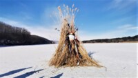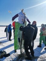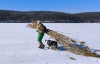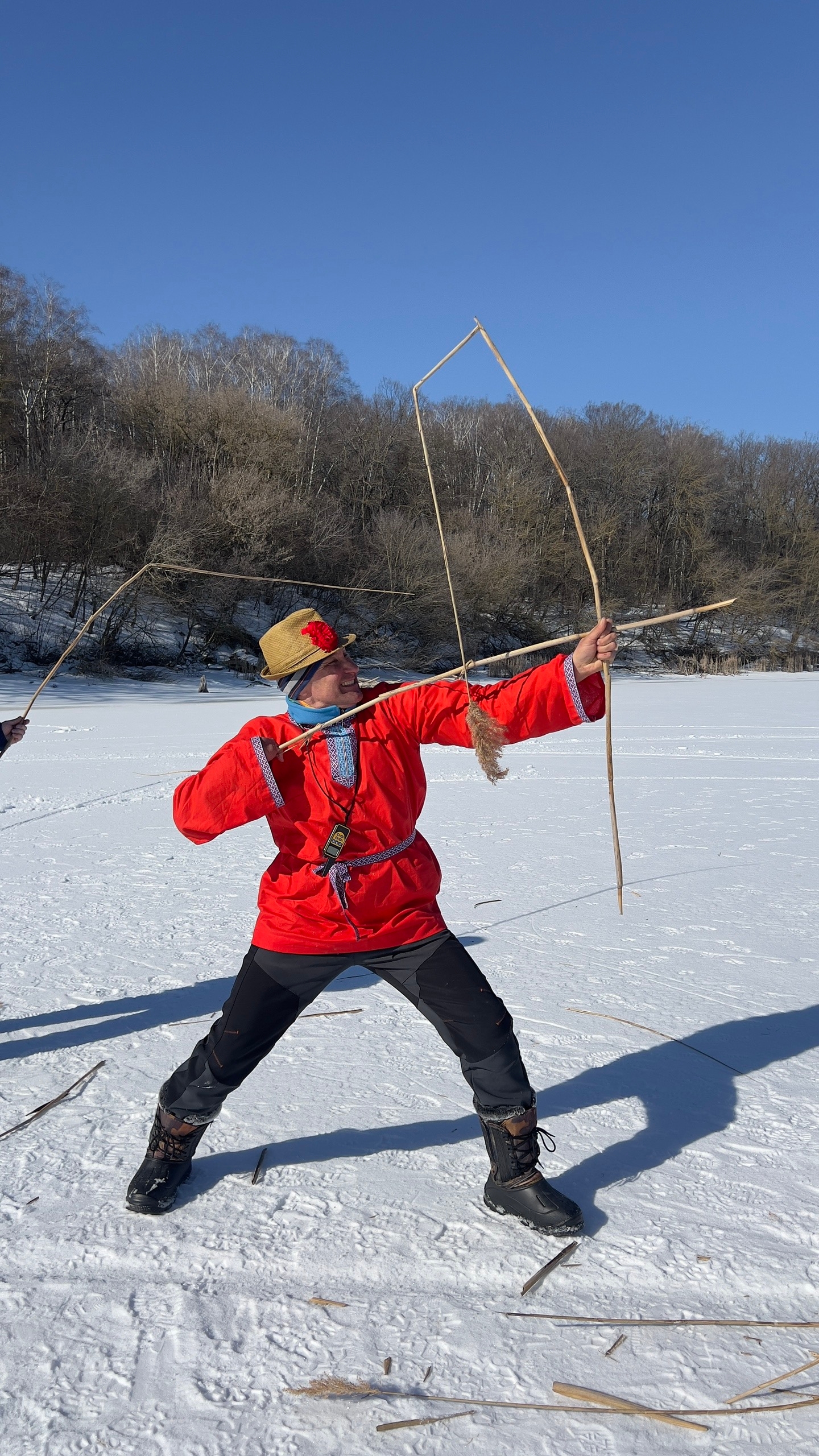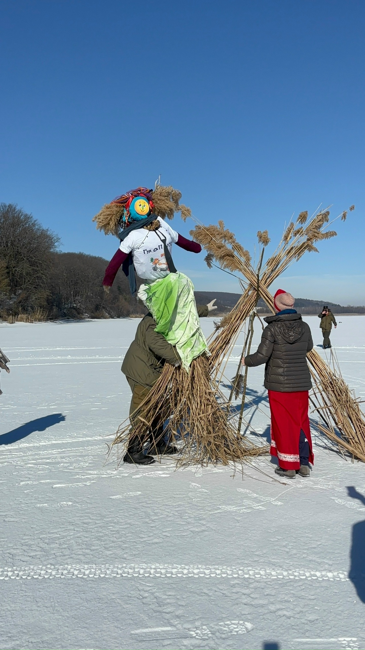 Изготовить соломенную женщину оказалось несложно. Дружно взялись за дело, принесли камыша, нафаршировали модные футболки и штаны, придав нужные формы там, где это требуется — творческий процесс, в котором каждый почувствовал себя скульптором. Притащили основу. Уж очень не хочется писать, что посадили её на кол, но без этого, масленица так и осталась бы загорать горизонтально. Красивая получилась дама, яркая. Встала она на льду, посреди речного простора, руки раскинула, солнышку улыбается. Такую и поджигать жалко, — это ж вам не чучело, похожее на певца Шамана, жечь, или Лабубу страшнючую. Решили пусть позагорает, а мы её пока эстафетами спортивными поразвлекаем да танцами в сарафанах.