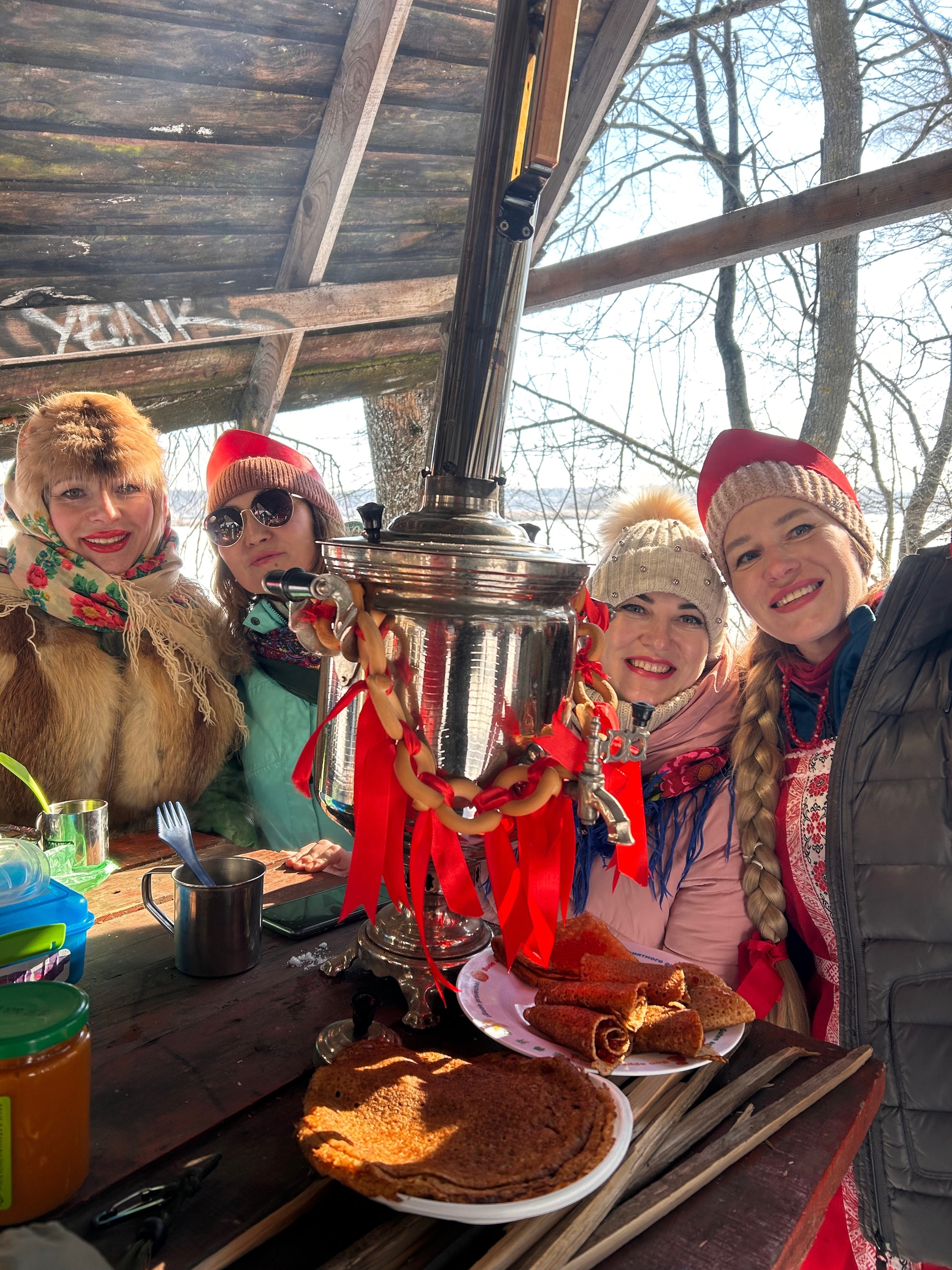 Чтобы прочувствовать настроение Масленицы, нужно взять блины, икру, варенье, не забыть самовар, инструменты для сооружения чучела и модные наряды. Ну и себя любимых украсить наилучшим образом. Настроение праздника создают русские сарафаны, платки, кокошники и косоворотки у парней. Сложив всё это в рюкзаки, можно отправляться в лес, провожать зиму. Так и сделали.