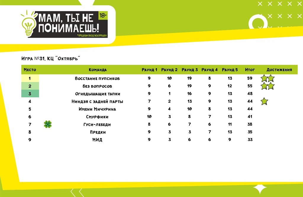 Успешнее всего пять игровых раундов на 30-й игре впервые преодолели ребята из команды «Ниндзя с задней парты». Они набрали 46 очков. На два квизовых балла меньше у коллектива «Огнедышащие тапки». Третьими стали представители команды «Имени Мичурина», у них на счету 40 очков.