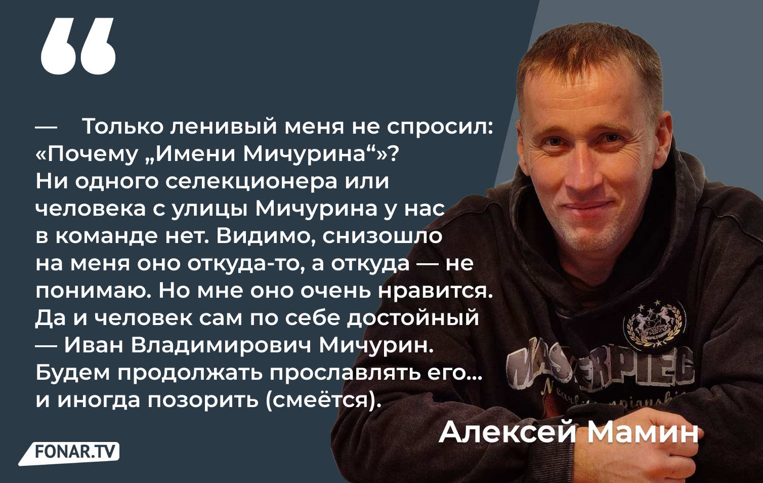 — Только ленивый меня не спросил: «Почему „Имени Мичурина“»? Ни одного селекционера или человека с улицы Мичурина у нас в команде нет. Видимо, снизошло на меня оно откуда-то, а откуда — не понимаю. Но мне оно очень нравится. Да и человек сам по себе достойный — Иван Владимирович Мичурин. Будем продолжать прославлять его… и иногда позорить (смеётся).