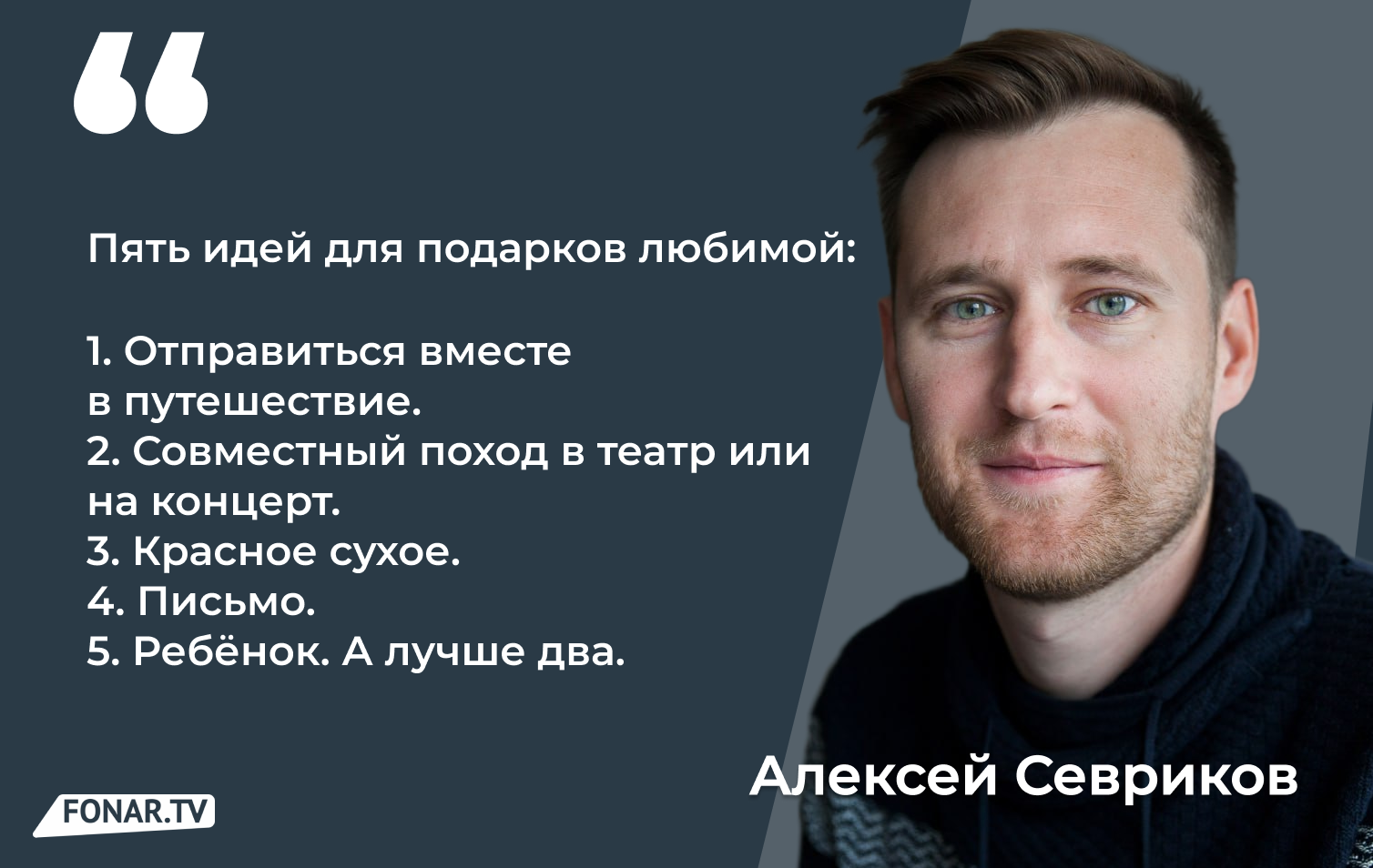 Сегодня ставшую уже традиционной рубрику мы решили преподнести для вас в весьма необычном ракурсе. Один за одним отмечаются два гендерных праздника: День защитника Отечества, а затем Международный женский день. И каждый из нас при их приближении начинает ломать себе голову над тем, а что же именно подарить? Поэтому традиционную пятёрку советов будут давать сразу двое представителей со стороны организаторов. Вопрос звучит так: назовите пять самых лучших на ваш взгляд вариантов к мужскому и женскому праздникам? Мужскую точку зрения на этот счёт озвучит Алексей Севриков, а женскую — Елена Красильникова.