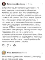 — Уважаемый Вячеслав Владимирович. Ситуация в доме по адресу Чехова, 32 остаётся сложной. Уже почти две недели, с 6 февраля, в доме наблюдаются серьёзные проблемы с отоплением. Сейчас в квартире всего 11 градусов тепла, и люди пытаются согреться всеми возможными способами. Управляющая компания «Жилищный фонд» не может эффективно решить эту проблему. Время от времени к нам приезжают сотрудники, проводят осмотр и уезжают, но тепло в дом так и не возвращается. Кроме того, нам постоянно приходится сталкиваться с грубостью по телефону. Несколько дней назад по данному адресу приезжали вы. Вы отчитались, что ситуация находится на контроле, но на самом деле до сих пор не могут люди согреться. Жильцы дома постоянно жалуются и сообщают о проблеме в различные инстанции. Однако в ответ получают только отговорки о том, что туда были отправлены рабочие и аварийные бригады, но ситуация не улучшается, — написала Анастасия Цыганкова 19 февраля на странице губернатора.