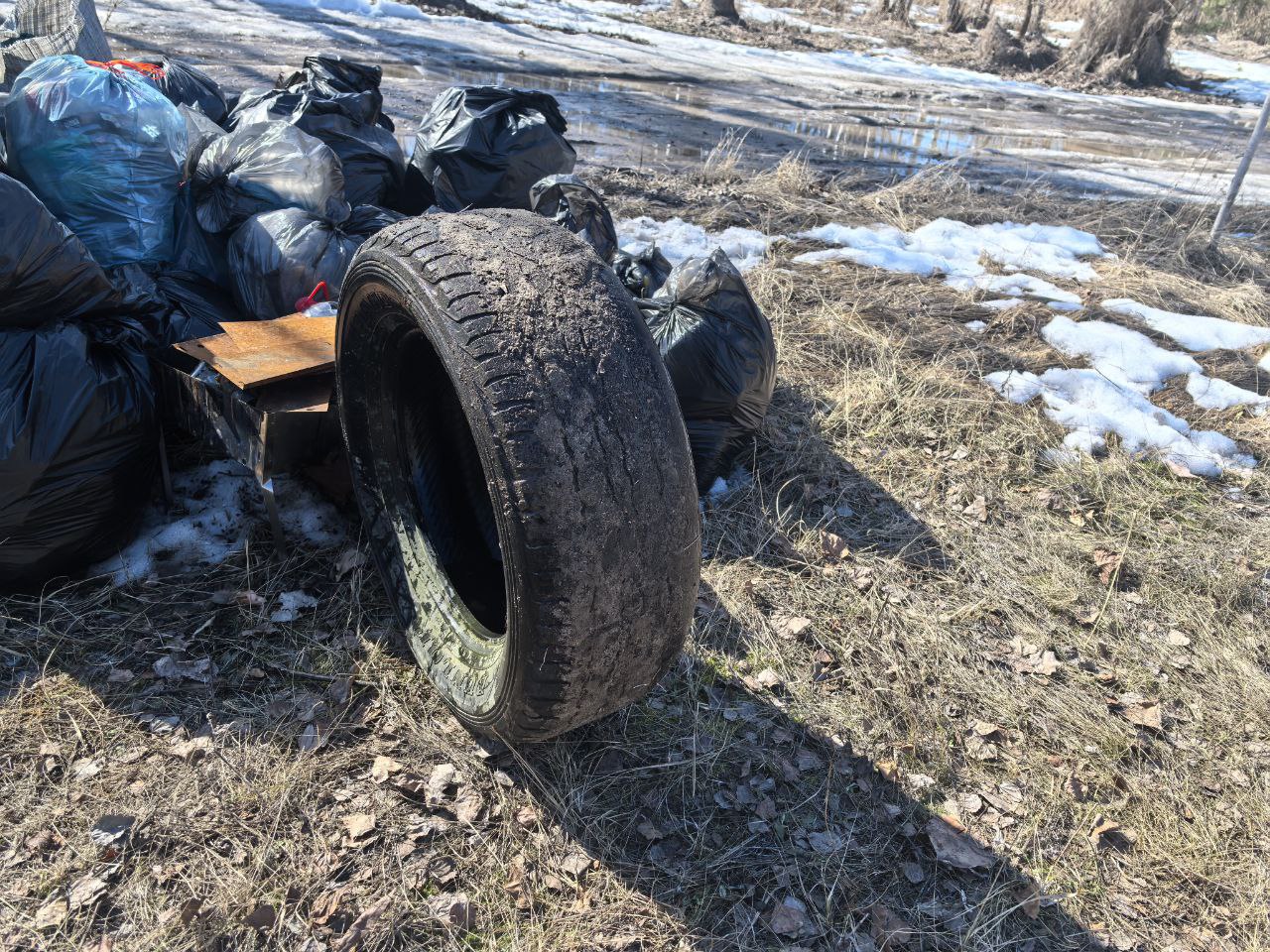 После двух часов уборки велосипедисты собрали все мусорные пакеты в одно место неподалёку от установленного бака — в него бы всё не поместилось. Наталья договорилась с администрацией, и там пообещали прислать машины, которые вывезут мусор. Получилось больше 30 мешков.
