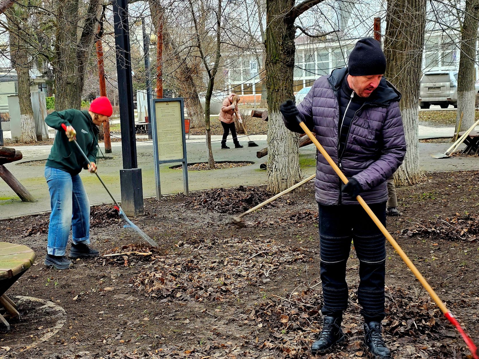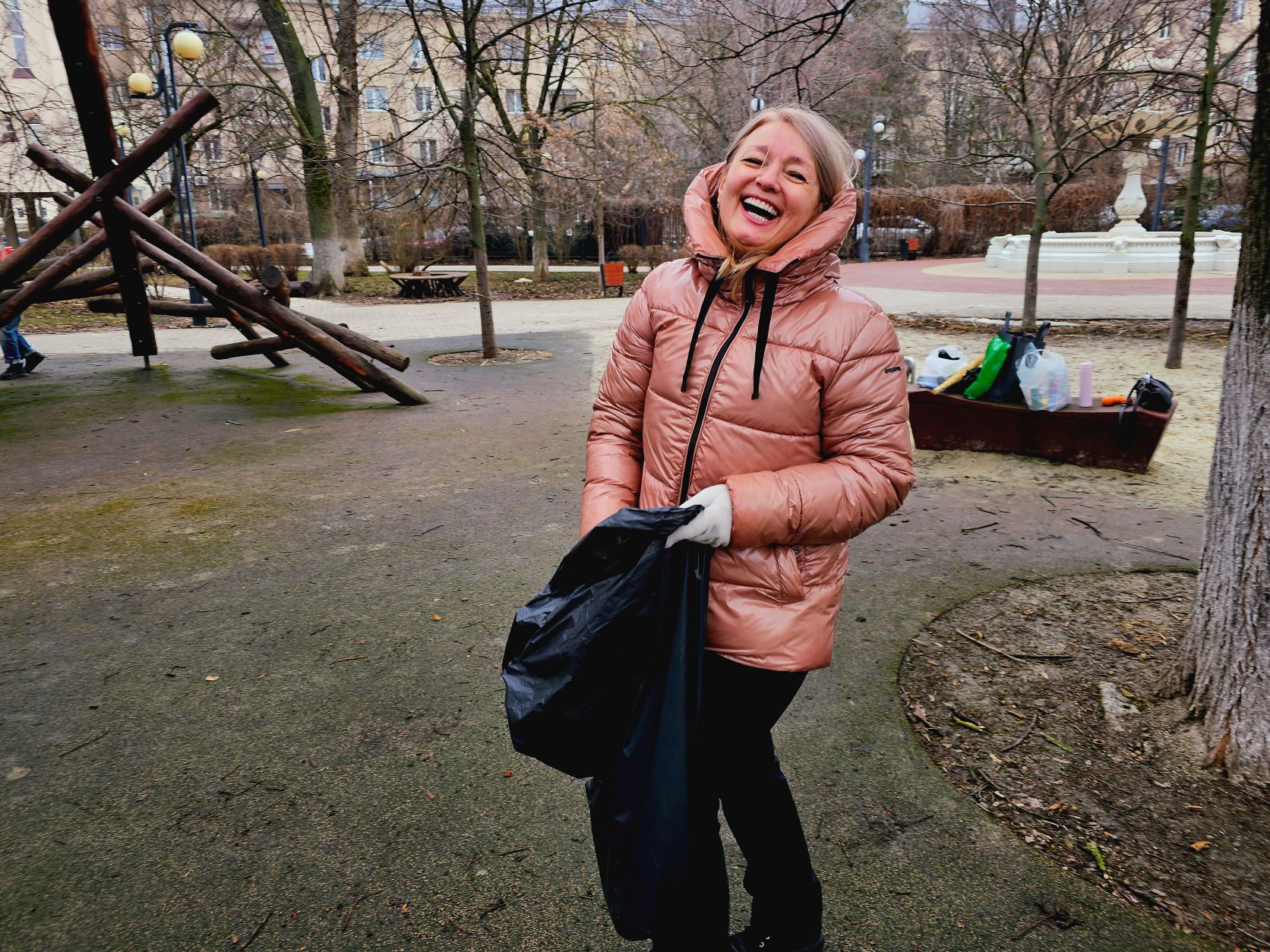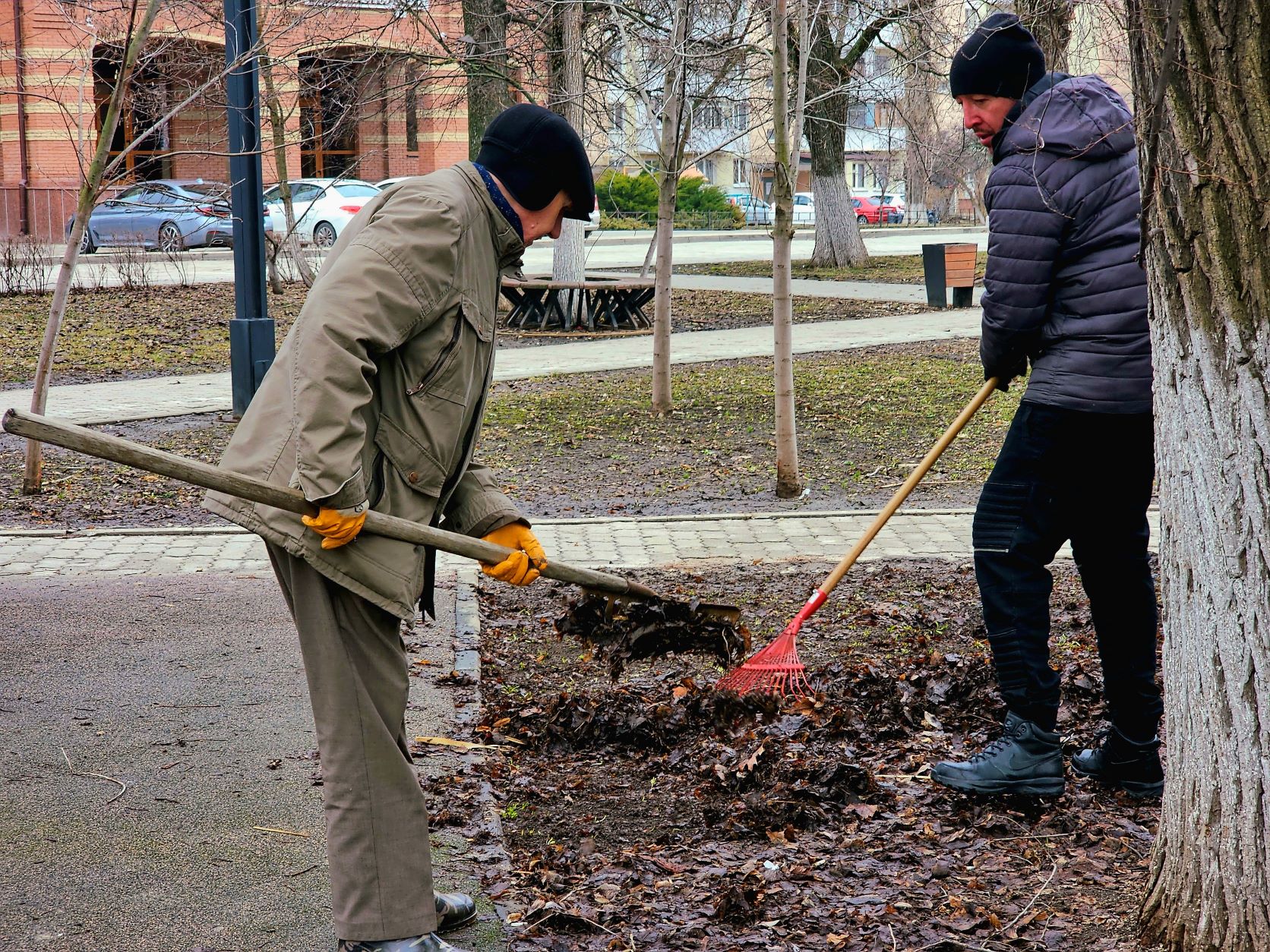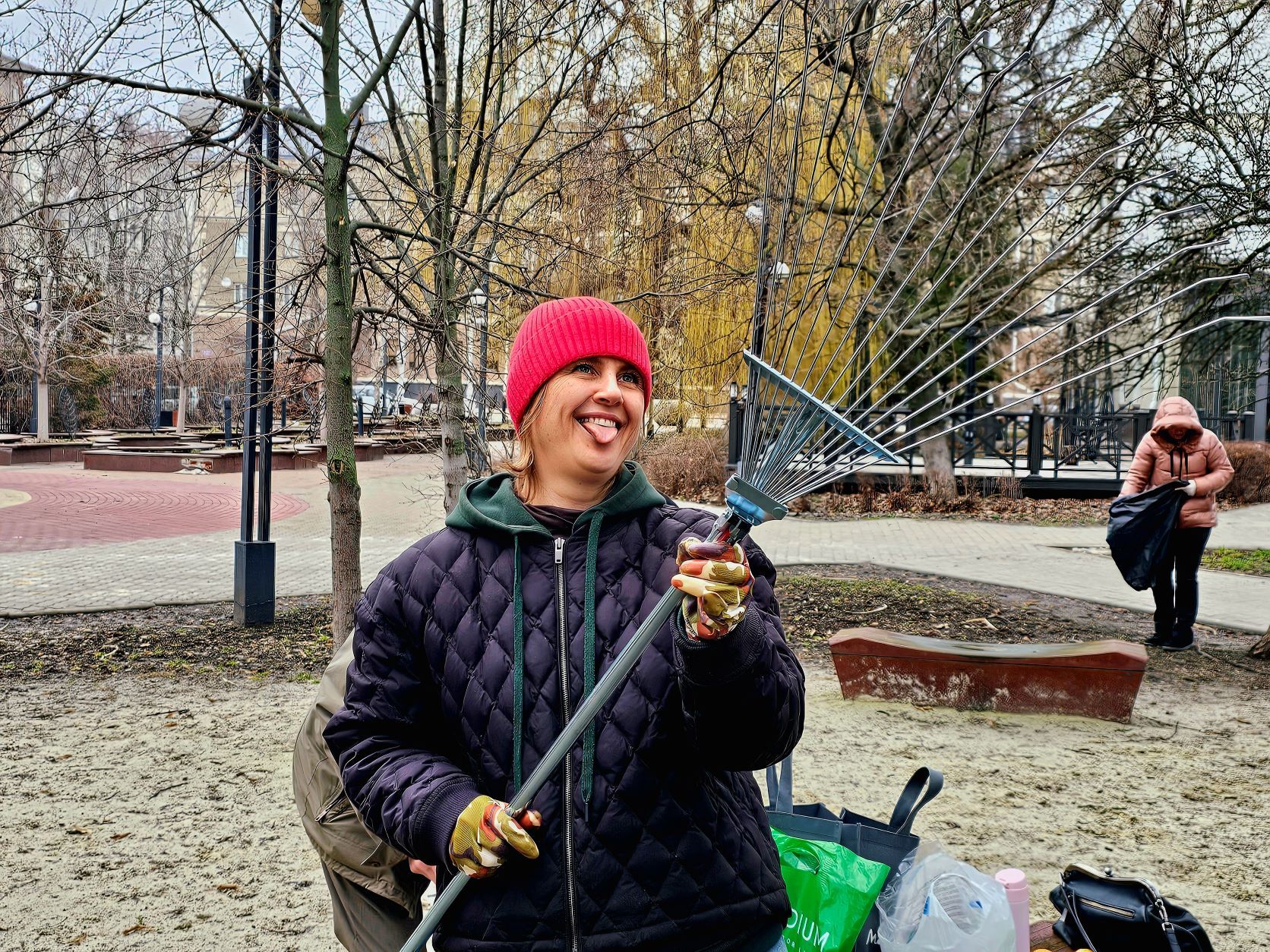 Марианна поделилась, что своих детей тоже оставила дома из-за холодной непогоды, но в следующий раз обязательно приведёт. Почти весь инвентарь — грабли, мётлы, мешки, перчатки, — принёс Валерий Денисович, пенсионер. Марианна в шутку назвала его «начальником по административно-хозяйственной части». Мужчина участвует во многих инициативах, которые ему предлагают его дети.
