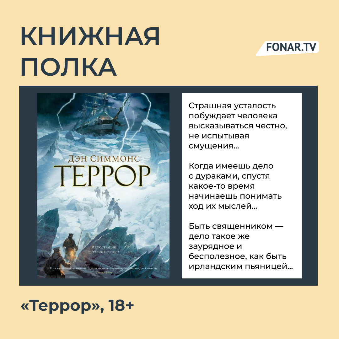 — Дэн Симмонс «Террор» — очень необычное произведение. Это своеобразная смесь исторического романа и мистического триллера, где все элементы гармонично находятся на своих местах. Это очень подробный экскурс в XIX век, взгляд на реальные экспедиции по изучению Арктики, погружение в особенности корабельного дела того времени. К этому очень реалистичному антуражу добавляется жуткий мистический компонент — зловещее чудовище, обитающее во льдах. Советую роман тем, кому интересна эпоха, обратная сторона первопроходства и атмосфера белоснежного ледяного ужаса, — рекомендует Владислав Морщинский.