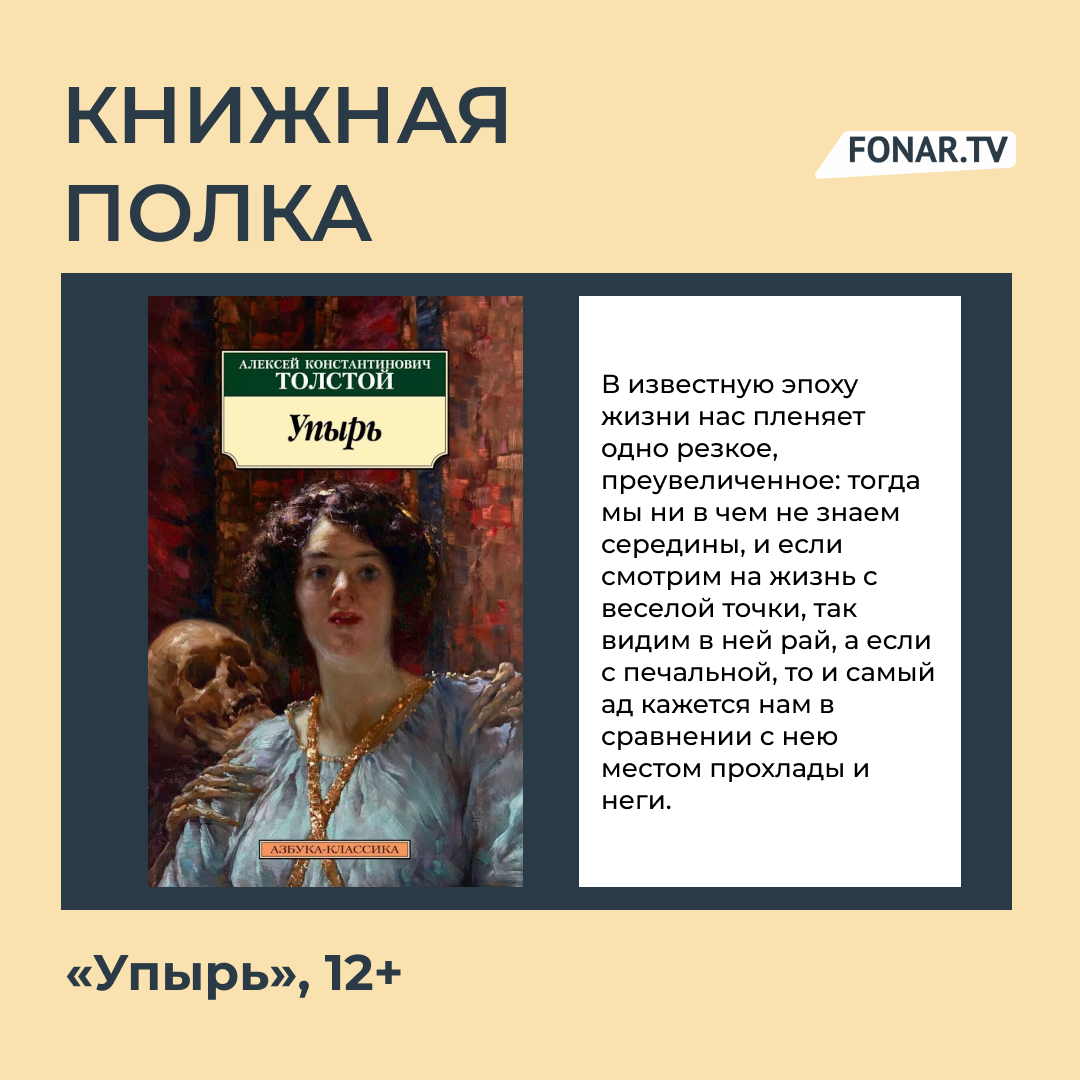 Для меня «Упырь» Толстого — это связующая ниточка между русской и иностранной литературой. Я ознакомился с повестью уже после того, как прочитал «Дракулу» Брэма Стокера (12+), и, когда принимался за чтение, был в своём юном высокомерии уверен, что это история про крестьянина в лаптях и неестественных на бородатом лице вампирских зубах. Однако Алексей Константинович удивил меня качественной прозой и совсем нестыдной историей.