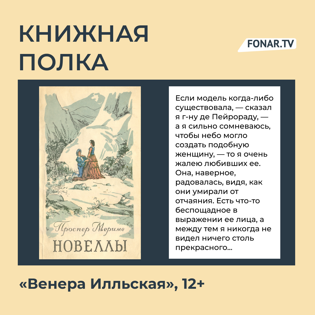 — Вдогонку советую новеллу французского писателя Проспера Мериме «Венера Илльская» (12+) с похожей особенностью. Правдива ли жуткая легенда об оживающей статуе-убийце, или же всё события в новелле являются странным стечением обстоятельств? Читатель должен решить сам, — продолжает давать советы, что почитать, Владислав.