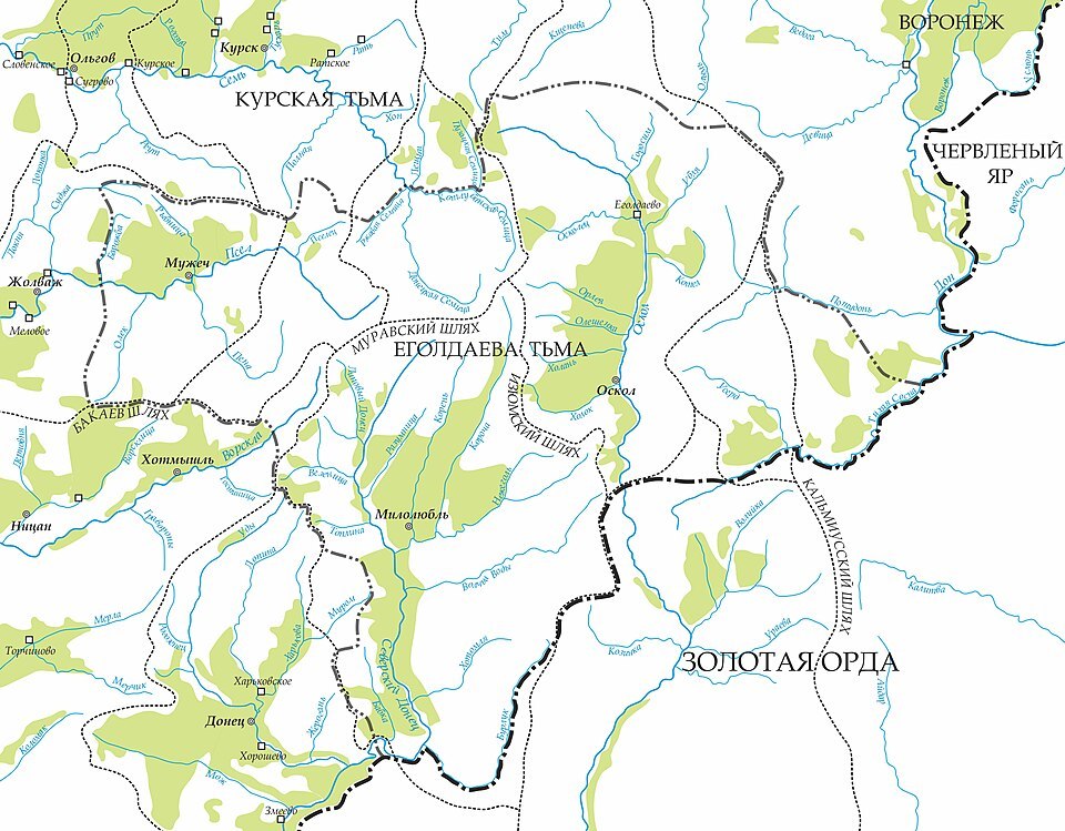 В середине XV века жил татарский князь Еголдай Сараевич — основатель Еголдаевой тьмы. Так называлось тогда татарское образование на территории современных Курской и Белгородской областей. Столица — Еголдаево городище — была на месте современного Старого Оскола. Еголдай был выходцем из Золотой орды, но подчинялся руководству Великого княжества Литовского, а Тьма Еголдаева входила в его состав. Кстати, княжество Литовское — это территория современной Беларуси, и в то время там тоже говорили на русском языке, а восточная его часть даже была православной. Еголдай собирал с жителей своей территории дань и отвозил в Литву.